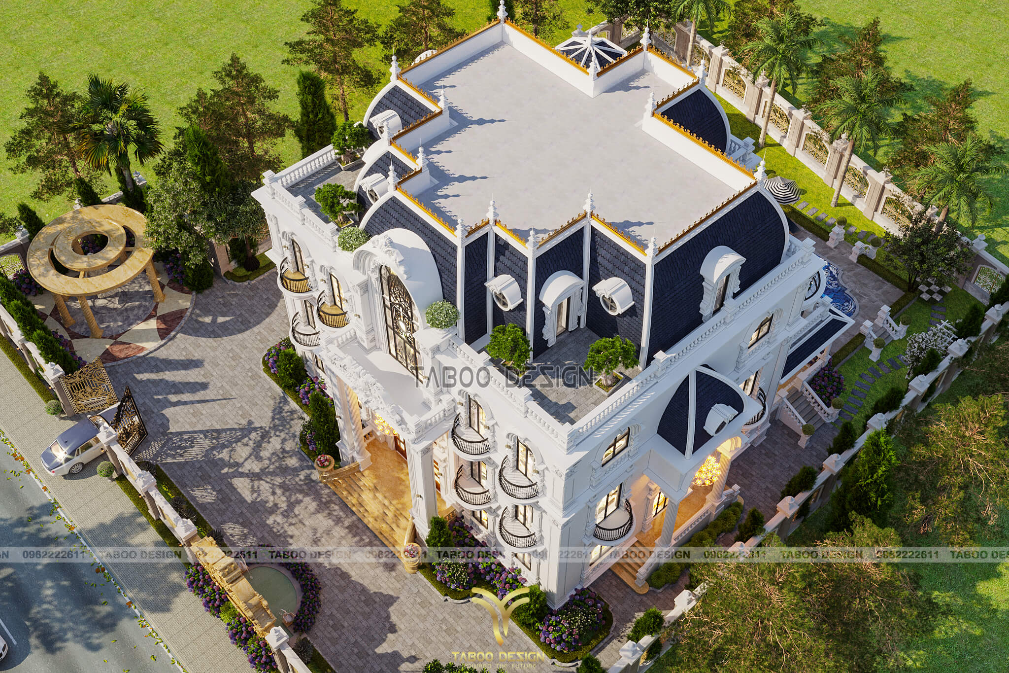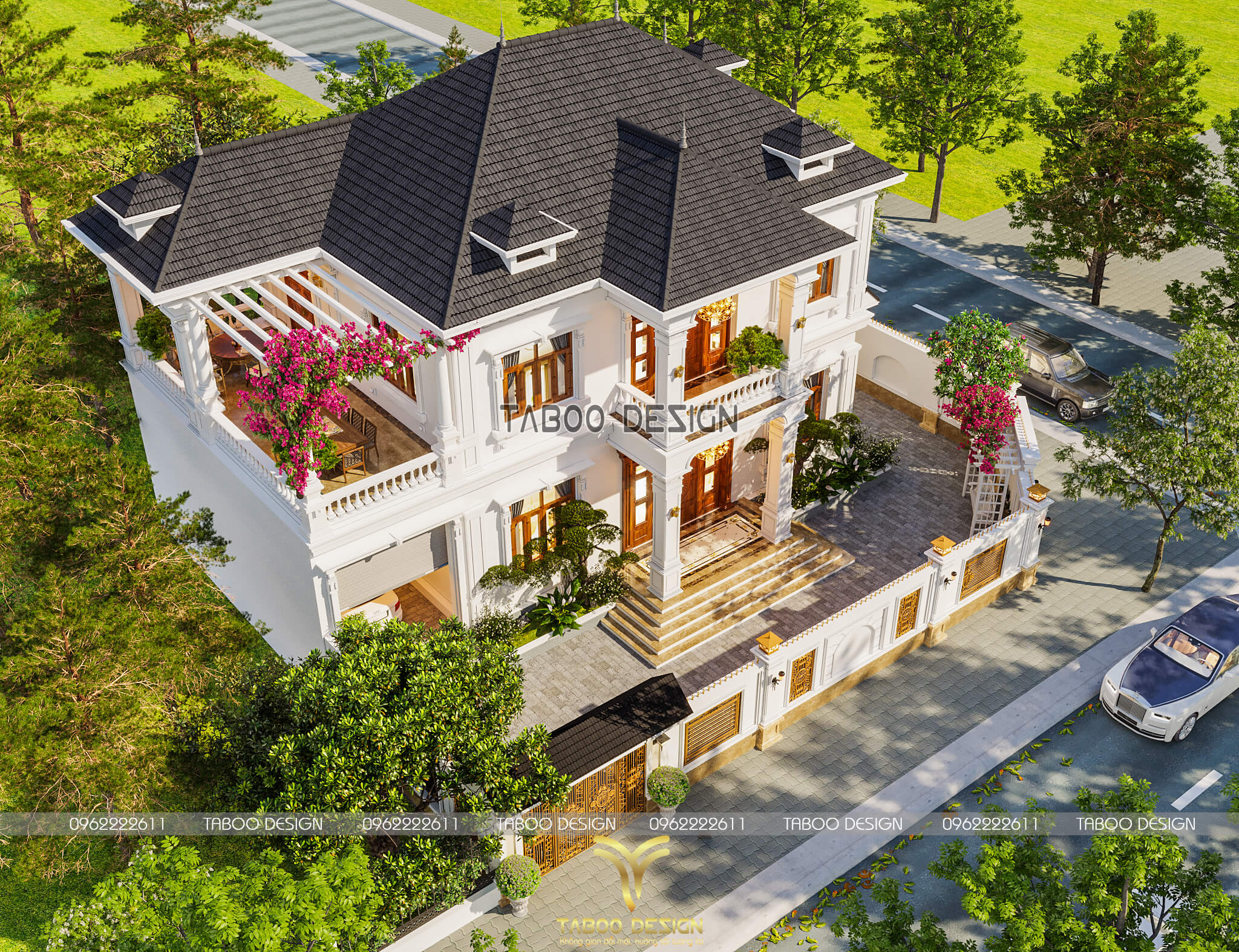 Phối cảnh toàn bộ công trình biệt thự vườn châu Âu từ trên cao