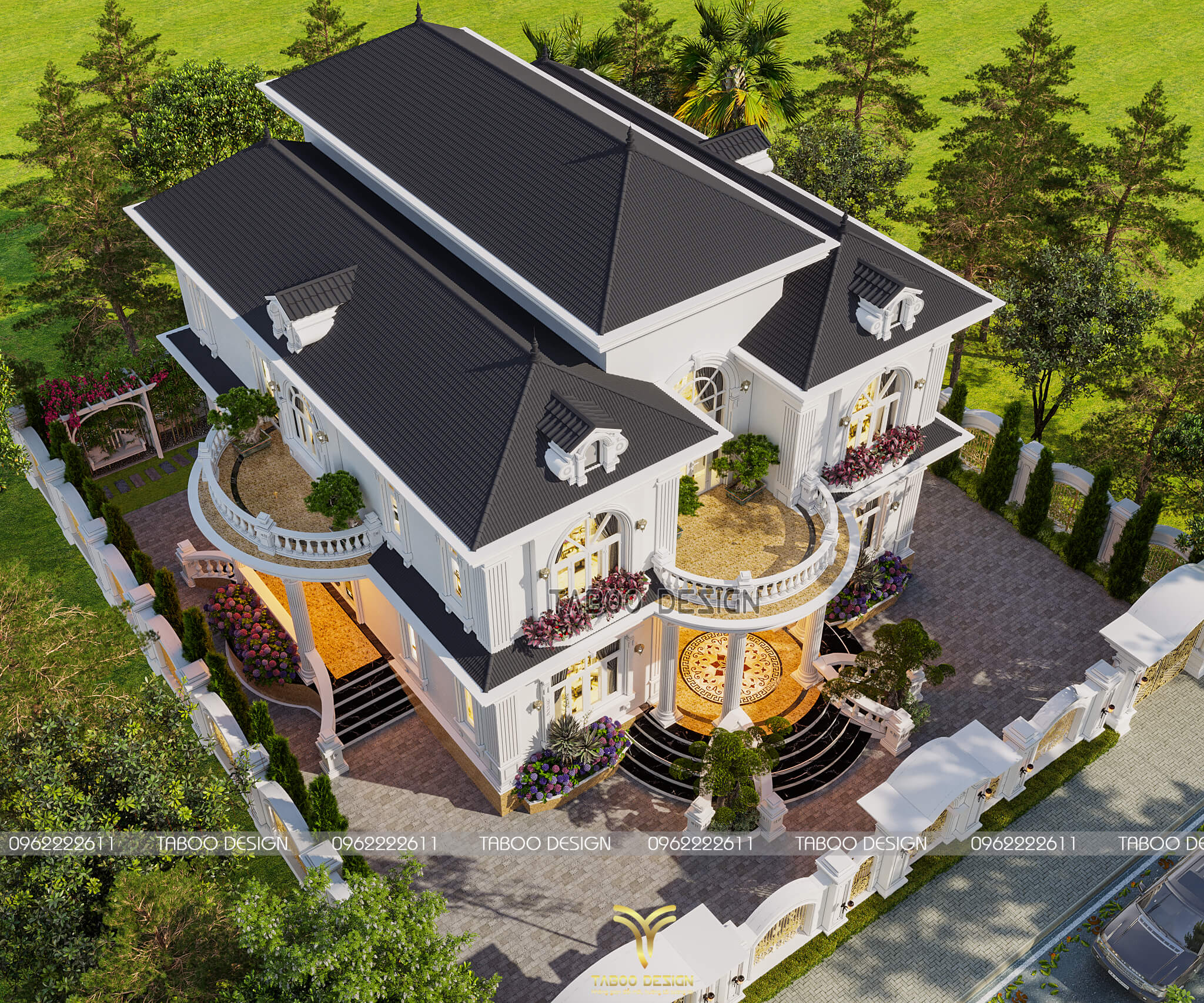 Công trình biệt thự cổ điển 3 tầng Pháp mang dáng vẻ nguy nga, đồ sộ, sẵn sàng chinh phục bất kỳ ai ngay từ lần đầu ghé thăm. Kiến trúc đăng đối, bề thế với những cột trụ đồ sộ, khỏe khoắn, những họa tiết đắp nổi cầu kỳ trải khắp mặt tiền, kết hợp với hệ mái chóp uy quyền, mang đến vẻ đẹp lộng lẫy, tráng lệ cho toàn bộ công trình.