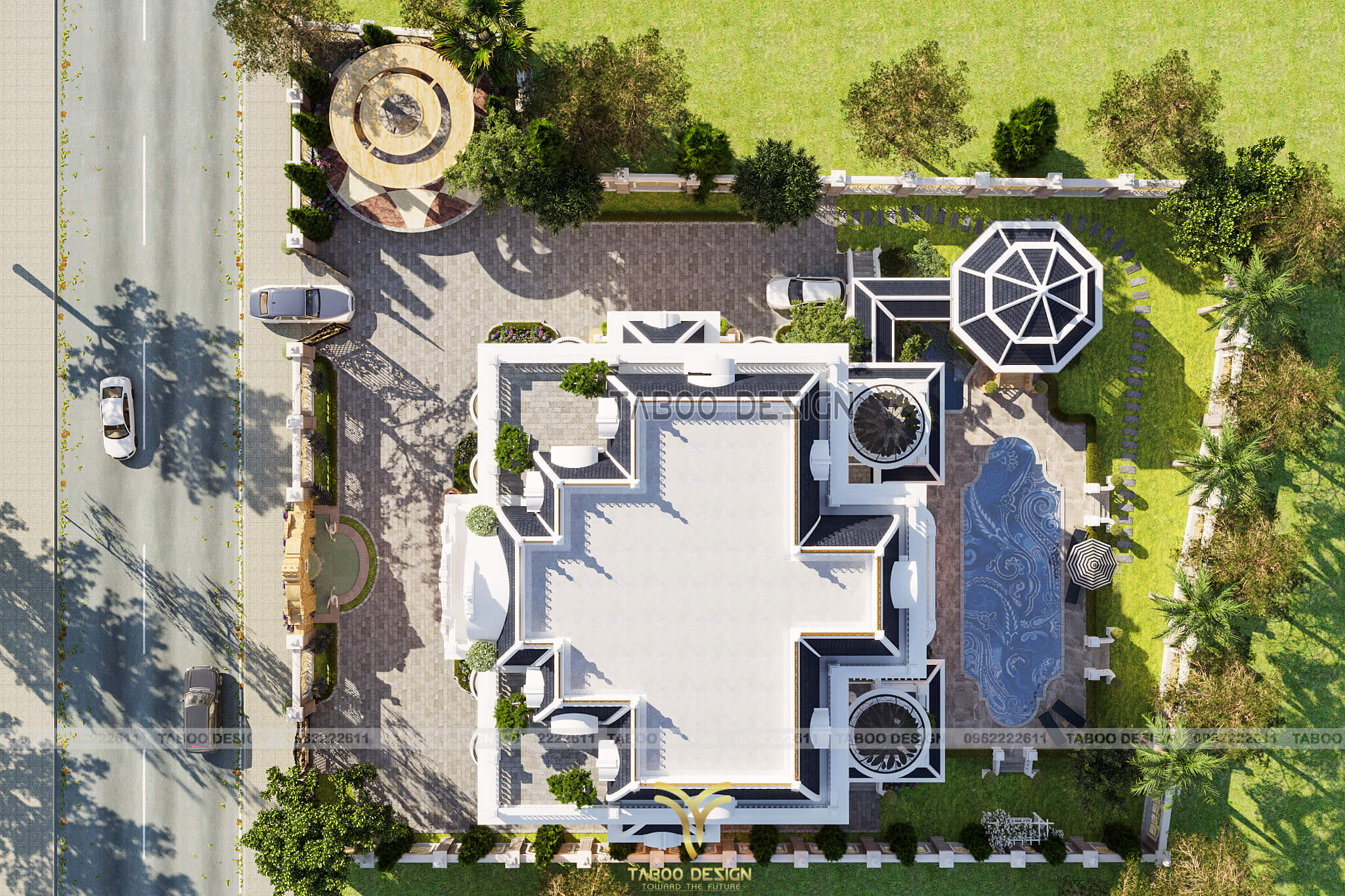 Phối cảnh toàn bộ công trình biệt thự vườn châu Âu từ trên cao