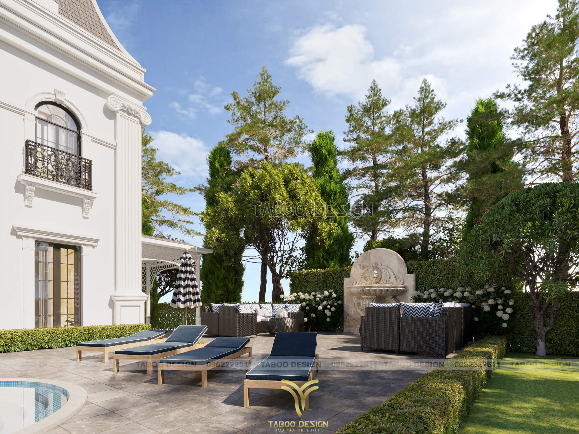 Công trình gây ấn tượng với kiến trúc tân cổ điển sang trọng, tinh tế, thiết kế 2 mặt tiền vô cùng bắt mắt kết hợp với khuôn viên sân vườn rộng, thoáng được trồng ngập tràn cây xanh, đan xen tiểu cảnh và hồ cá sinh động. Biệt thự đặt lệch sang phải dành lối đi ra vườn sâu với bể bơi ngoài trời rộng rãi, hiện đại, tạo không gian vui chơi, thư giãn riêng tư, kín đáo cho cả gia đình