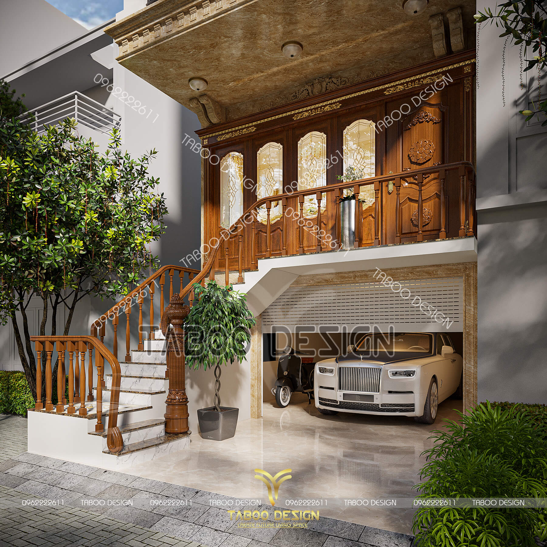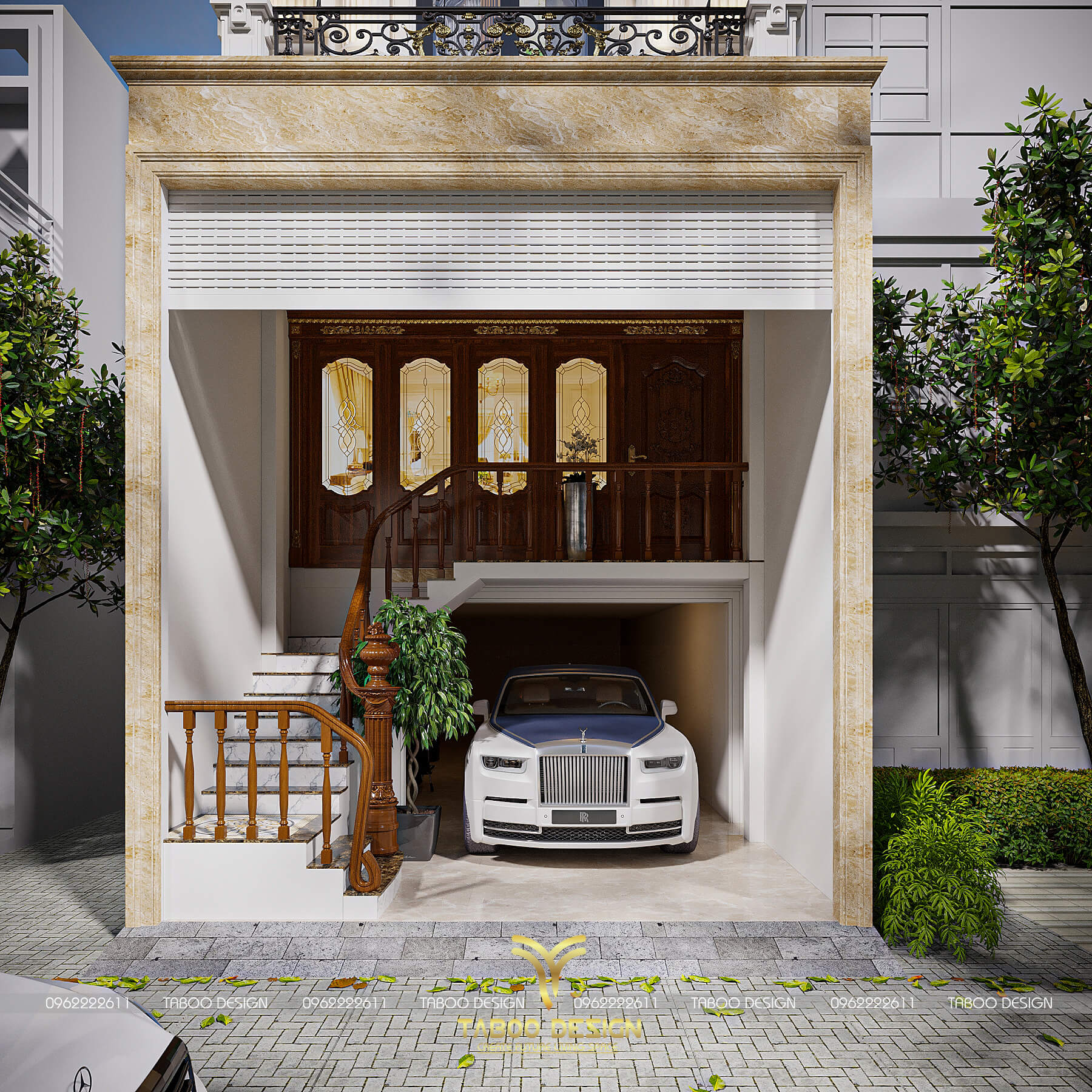 Tầng hầm là giải pháp lý tưởng để mở rộng diện tích sử dụng cho các căn biệt thự phố mà không làm ảnh hưởng đến vẻ đẹp thẩm mỹ của công trình. Với công trình biệt thự 4 tầng tân cổ điển này, Taboo Design đã thiết kế tầng hầm vừa giúp nâng cao thế đứng của căn biệt thự, giúp công trình thêm phần cao ráo, bề thế đồng thời giúp không gian bên trong tầng hầm luôn thông thoáng với anh sáng tự nhiên. Lối ra được bố trí ngay mặt tiền, thuận tiện cho việc di chuyển xe ra vào. Bên cạnh là bậc thềm tam cấp sang trọng dẫn lối vào bên trong biệt thự.