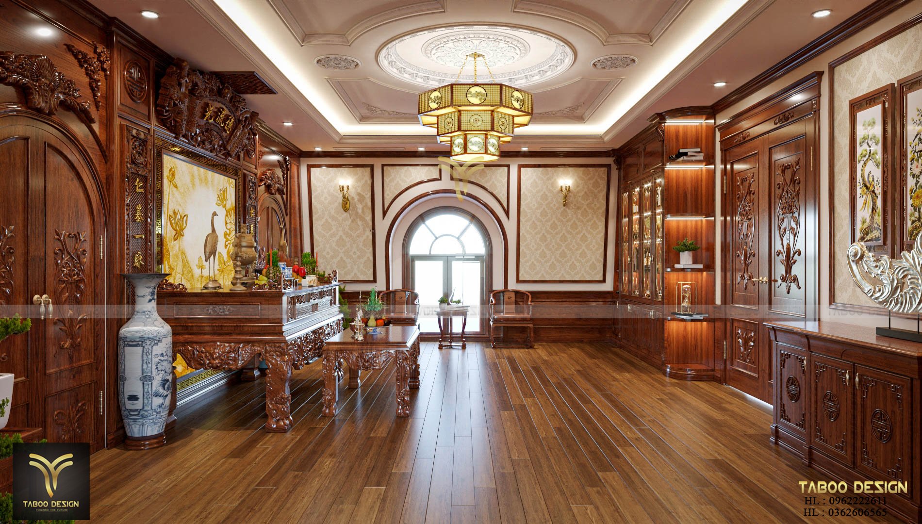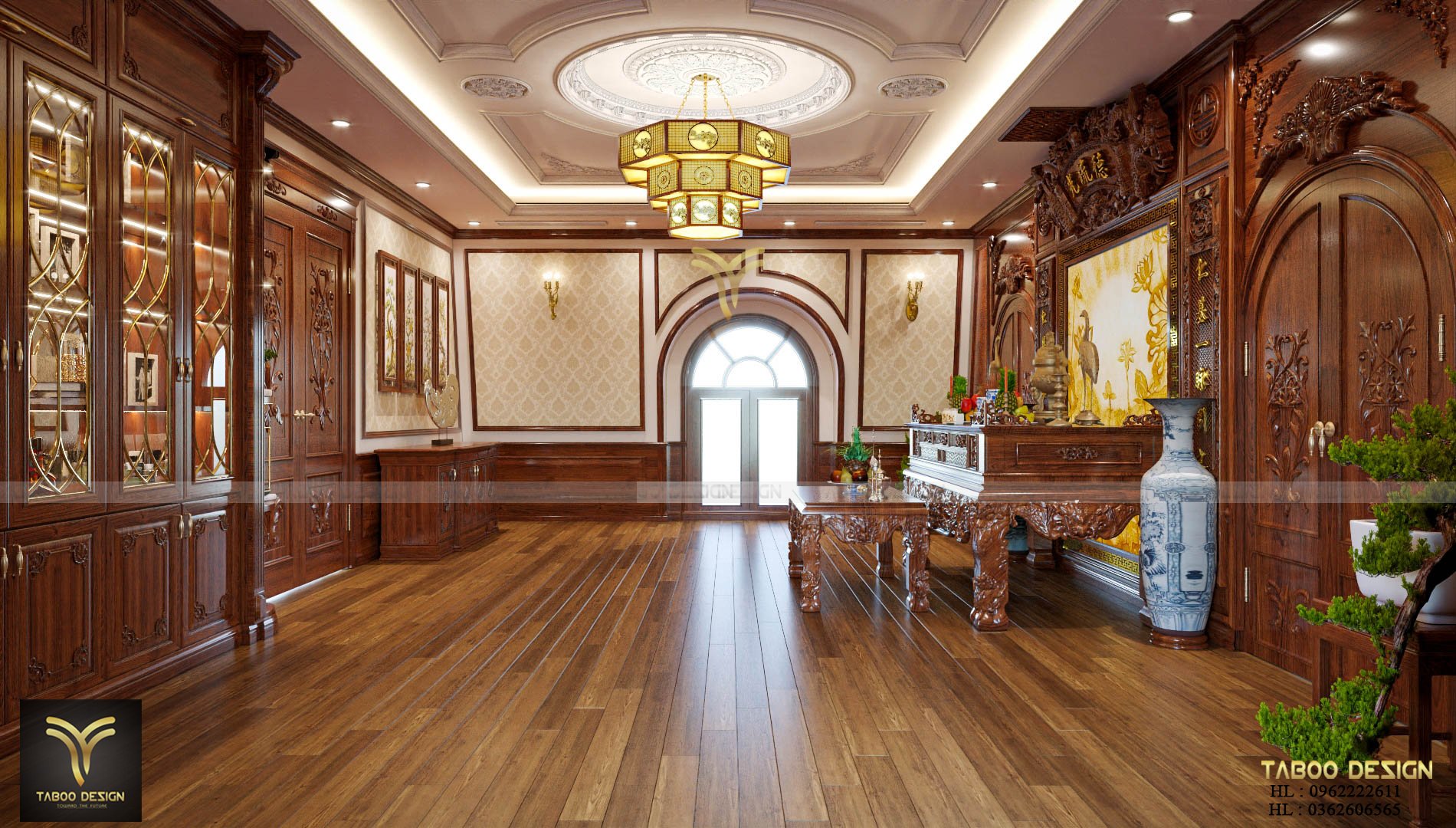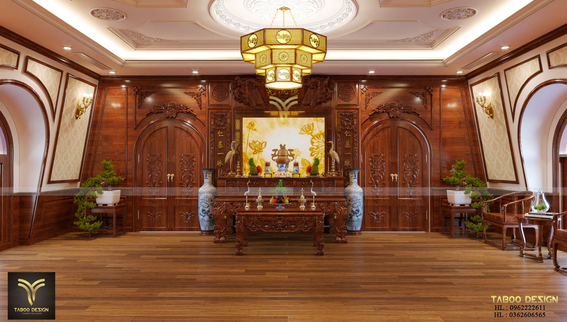 Bên cạnh phòng khách là không gian phòng thờ được thiết kế trang trọng và ấn tượng. Hệ thống bàn thờ, tủ thờ sử dụng gỗ tự nhiên cao cấp sơn màu nâu đánh bóng vô cùng nổi bật trên gam tường màu trắng. Không gian thờ cúng của ngôi biệt thự được đặt đúng vị trí, hợp phong thủy gia chủ và thông với phòng khách, tạo sự tiện nghi cho chủ đầu tư trong quá trình thờ cúng tổ tiên.
