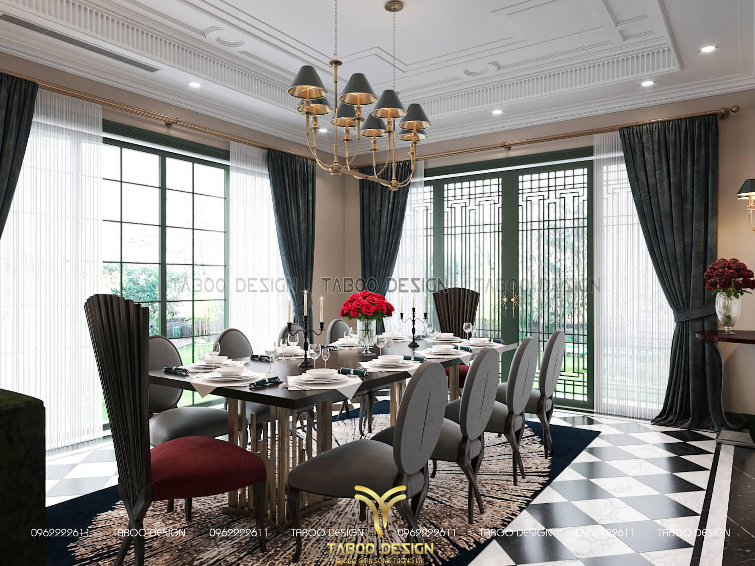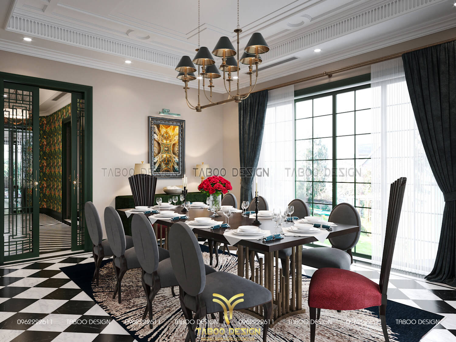 Bộ bàn ăn 10 người với thiết kế khung gỗ bọc đệm vải nỉ, bàn ăn khối gỗ vuông lớn với đường vân gỗ đẹp mộc mạc. Bên cạnh hệ thống đèn âm trần chiếu sáng thì để tăng lên không gian thoáng rộng hơn, các KTS đã thiết kế hệ thống cửa kính lớn ở 2 bên diện tường. Thiết kế rèm cổ điển 2 lớp đồng điệu với màu sắc chung vô cùng bắt mắt.
