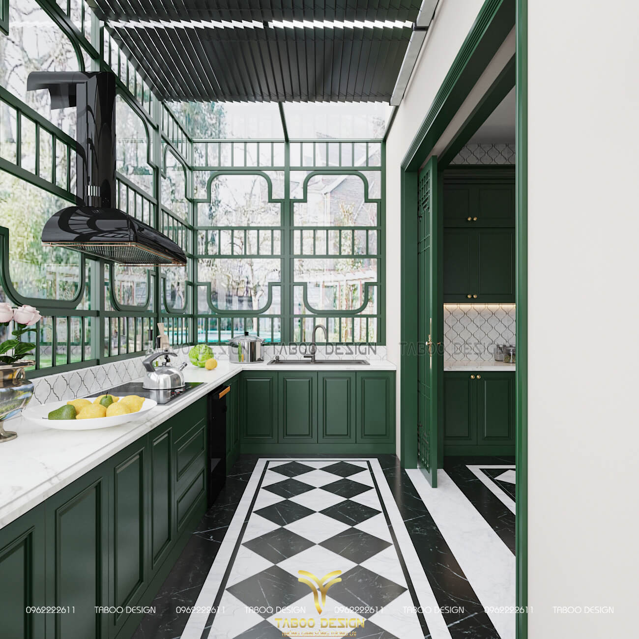 Không gian bếp á bằng hệ mái kính trang trí đẹp mắt