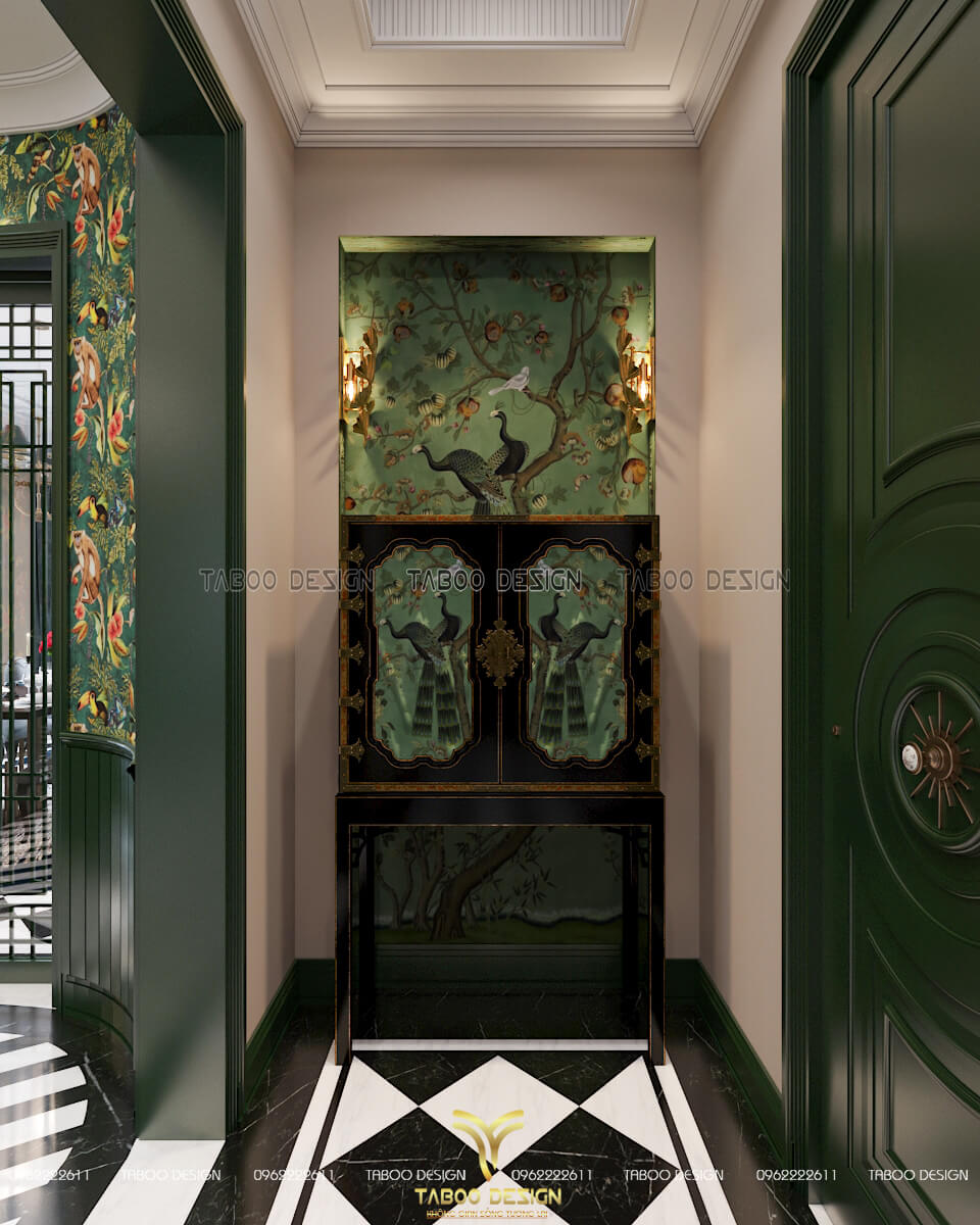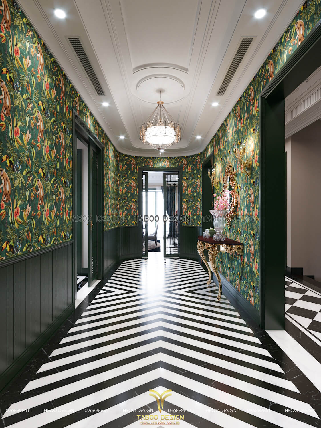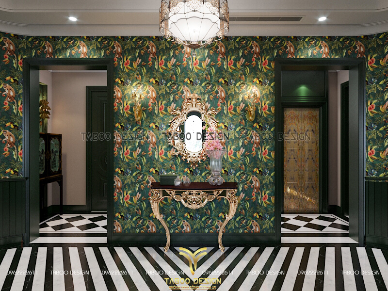 Không gian sảnh chính được trang trí lớp giấy dán tường mang sắc thái vùng khí hậu nhiệt đới
