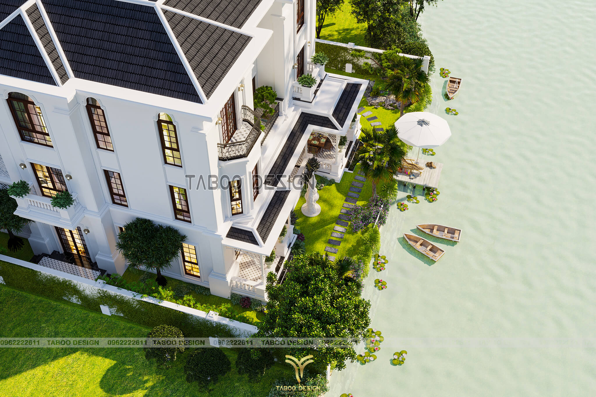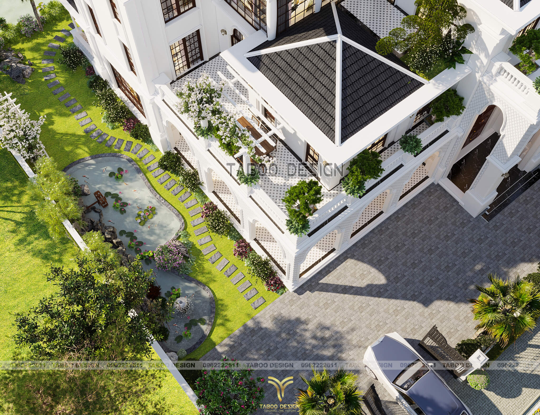 Toàn cảnh phối cảnh sân sau biệt thự tân cổ điển khi nhìn từ trên cao xuống