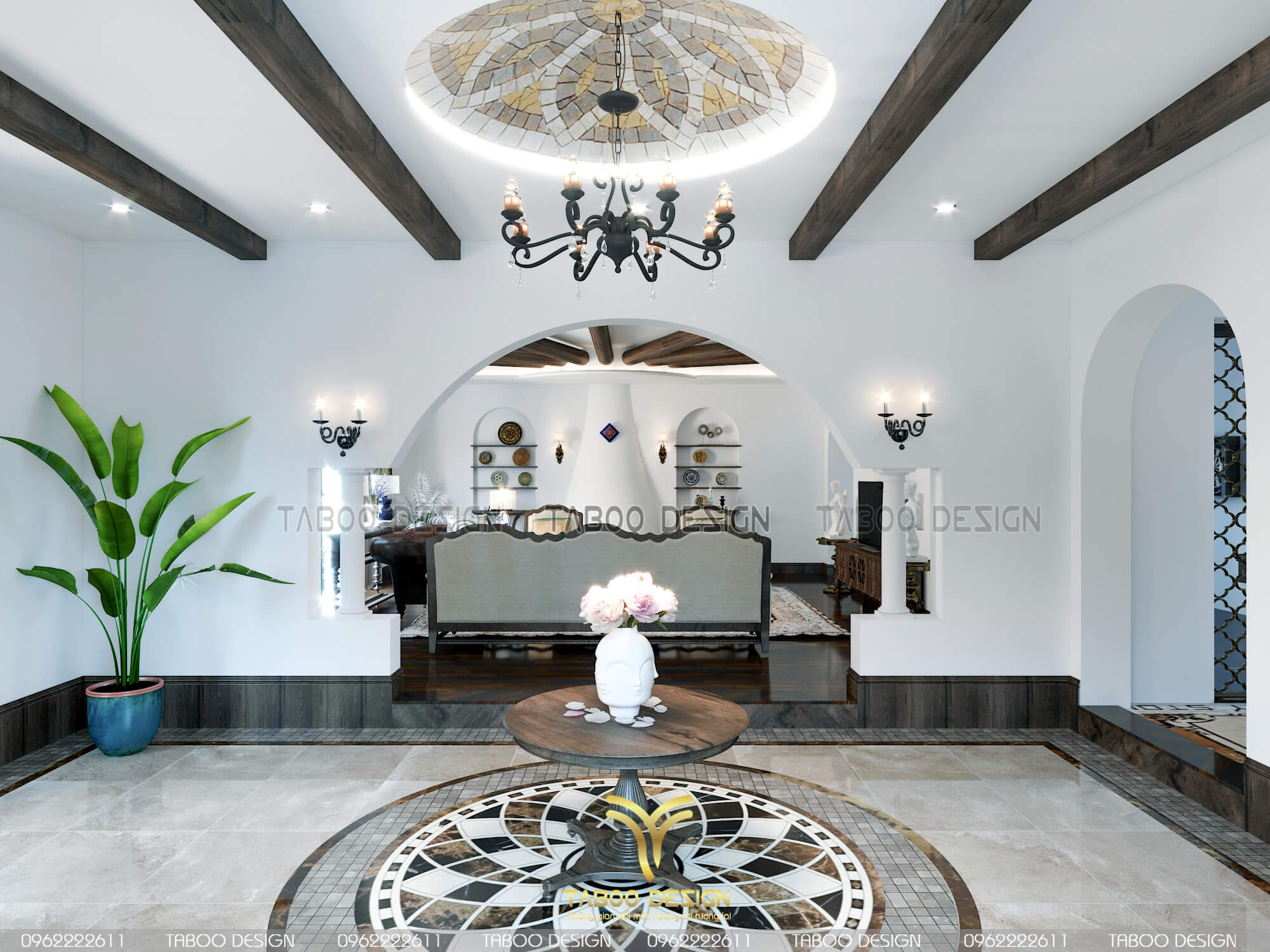 Phối cảnh không gian sảnh chính biệt thự 3 tầng phong cách Địa Trung Hải