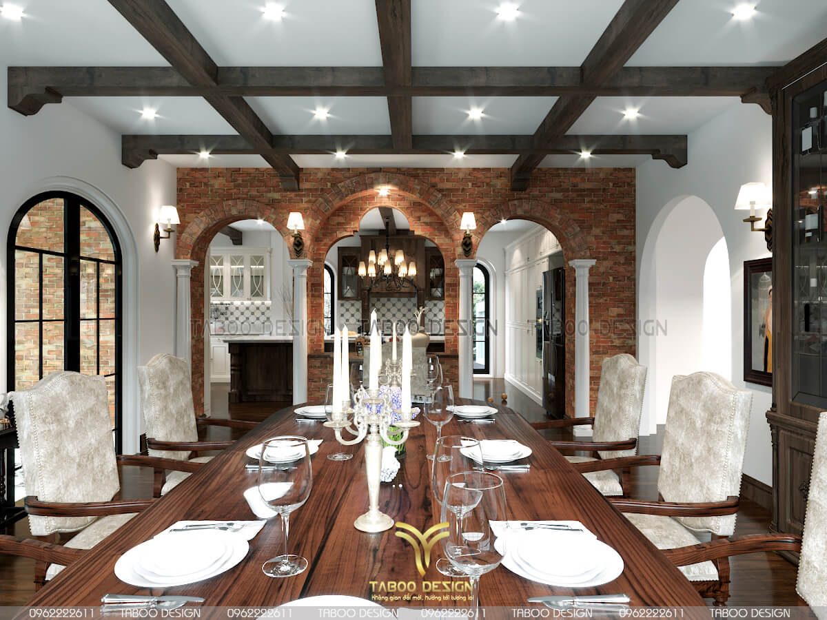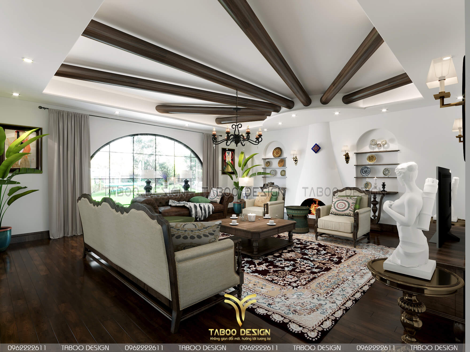Một trong những đặc trưng của kiến trúc Địa Trung Hải là sử dụng những hình vòm với tỉ lệ cân đối cho thiết kế cửa chính, cửa sổ và vòm hiên mái che. Cách thiết kế này giúp đảm bảo tính thẩm mỹ cũng như tạo nên nét riêng biệt, cuốn hút cho công trình. Để giúp cho biệt thự 3 tầng đón ánh sáng và gió được dễ dàng, hệ cửa chính bằng gỗ tự nhiên kết hợp kính cường lực và hệ cửa sổ bằng khung nhôm xingfa kết hợp kính cường lực. Có thể thấy biệt thự được thiết kế theo xu hướng mở làm tăng sự thoáng đãng cho không gian nội thất.