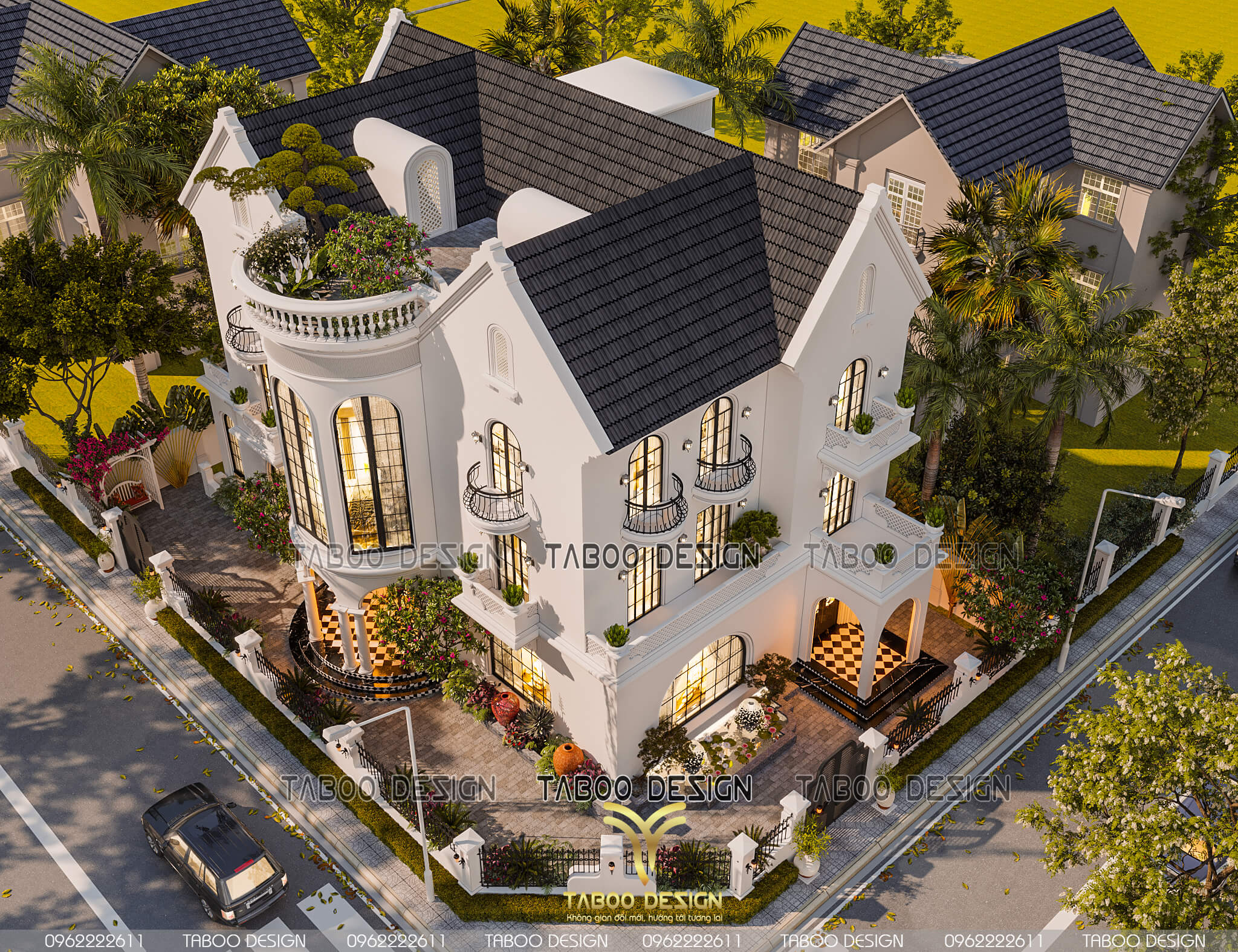 Phối cảnh nhìn từ trên cao biệt thự 3 tầng kiến trúc Địa Trung Hải tại Hà Nội