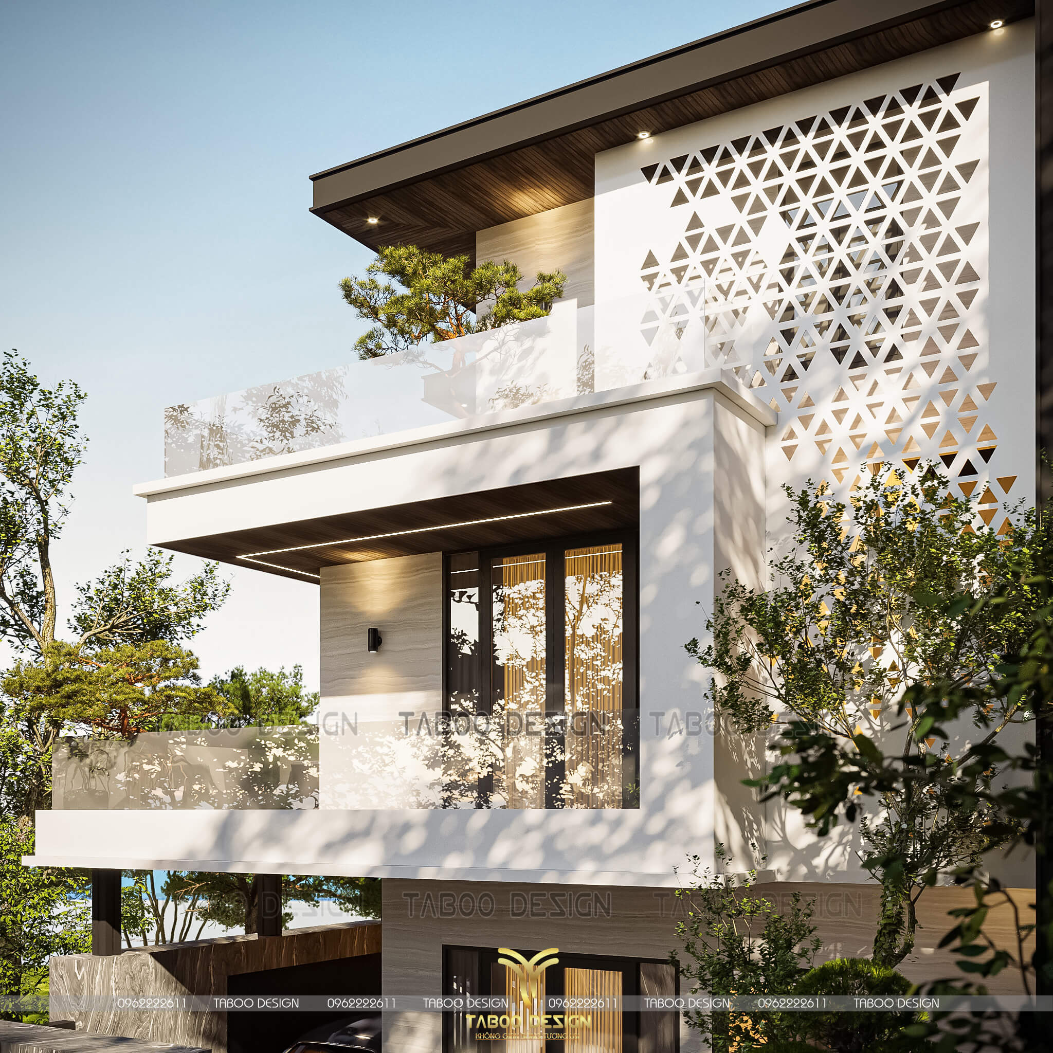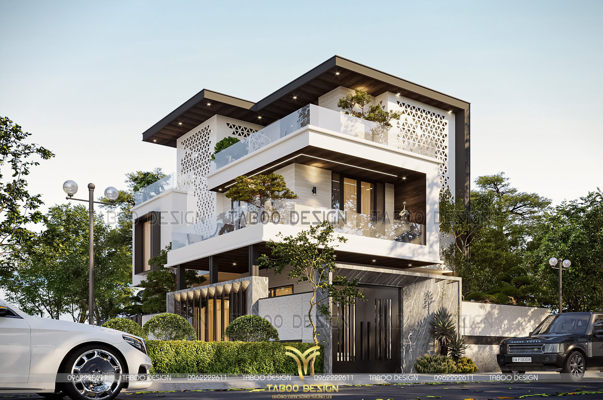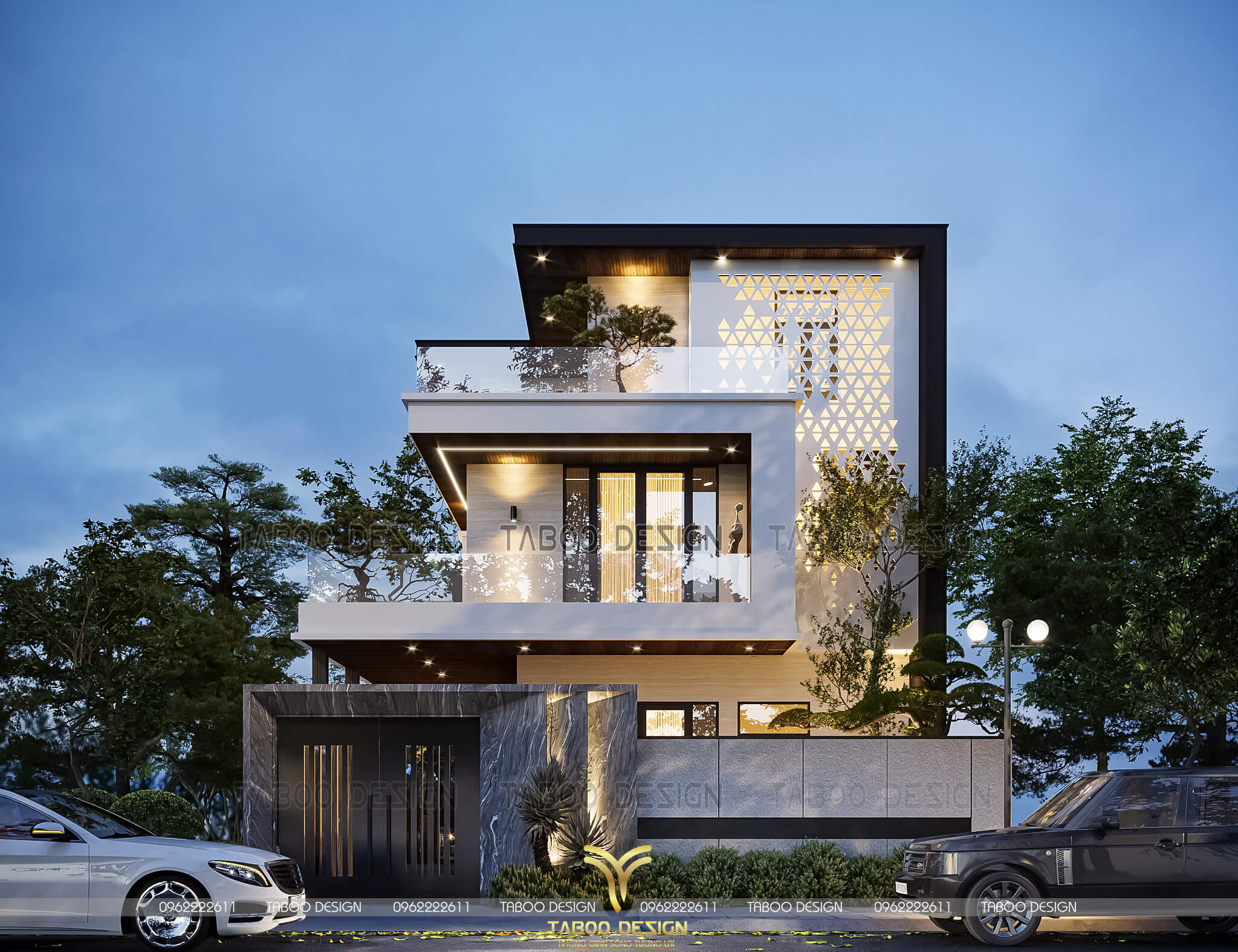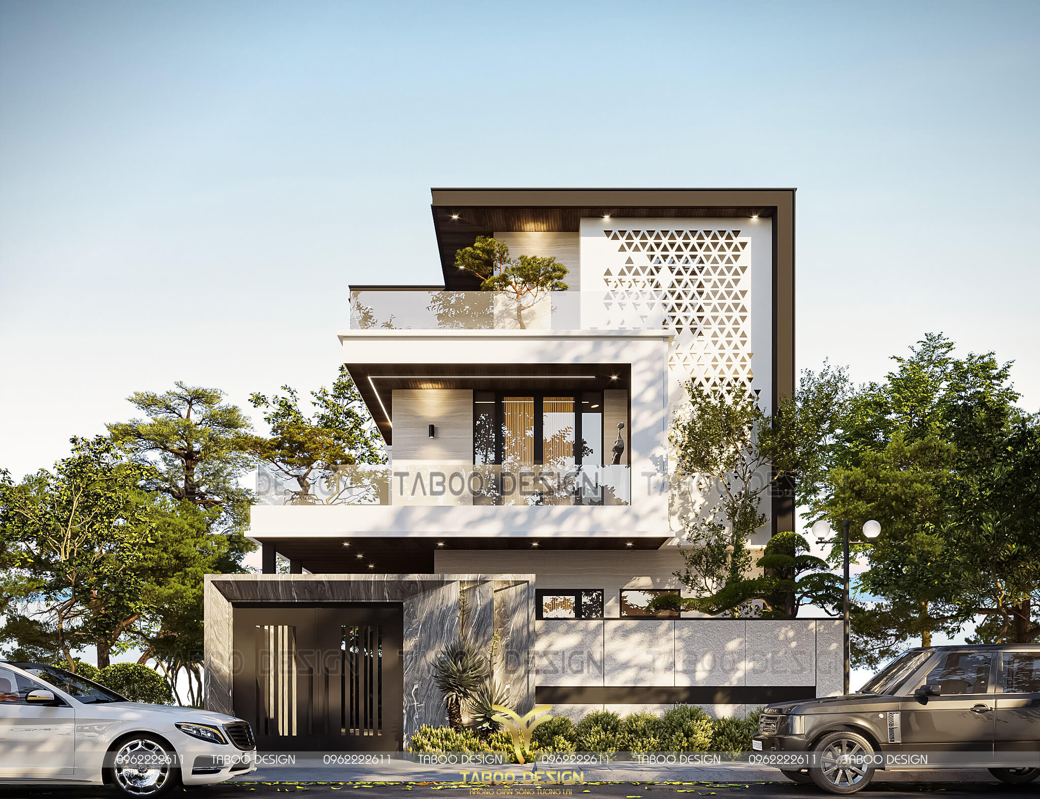 Cùng với vật liệu và màu sắc hiện đại, ngôi biệt thự được thiết kế các dầm, viền khung ấn tượng tạo hình khối giật mạnh mẽ cho ngoại thất và được mở thoáng với ban công rộng ở tất cả các phòng ngủ view ra không gian bên ngoài. Phối cảnh tổng thể công trình, nhìn từ mặt đường vào, mẫu biệt thự 3 tầng hiện đại mang những đường nét góc cạnh nhưng tinh tế và lôi cuốn.