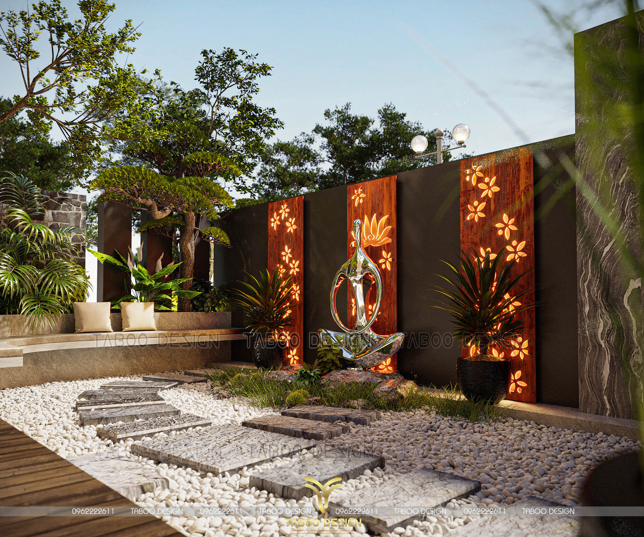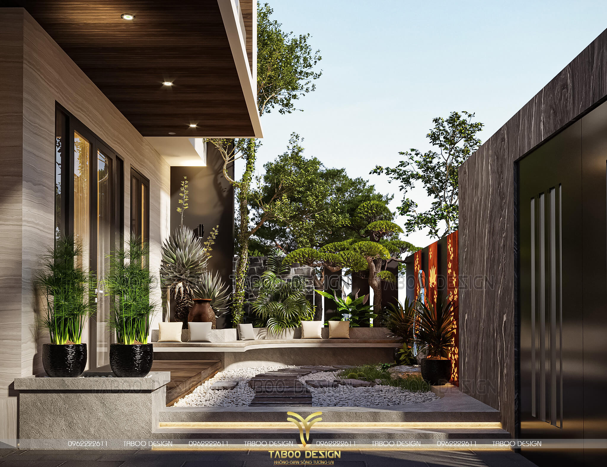 Với diện tích không quá lớn nhưng mọi góc trong căn biệt thự cũng đều đượcTaboo Design kỳ công nghiên cứu và thiết kế. Một góc sân vườn với lối bậc thang bê tông kết hợp đèn sân vườn cùng các tiểu cảnh vô cùng sống động. Thiết kế sân vườn có thể kết hợp với các yếu tố khác như lối đi giúp lưu thông qua khu đất mà không gặp nhiều trở ngại.