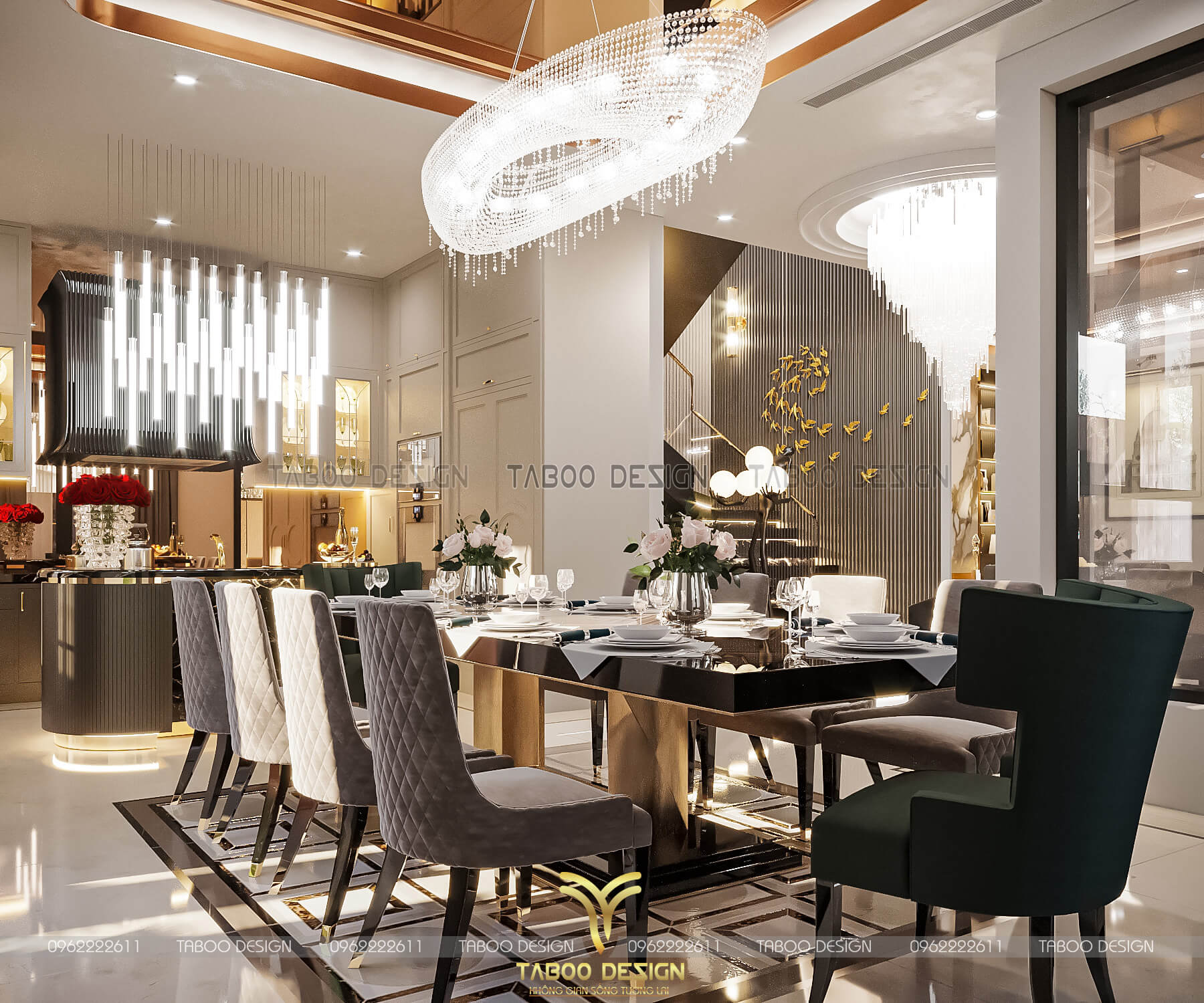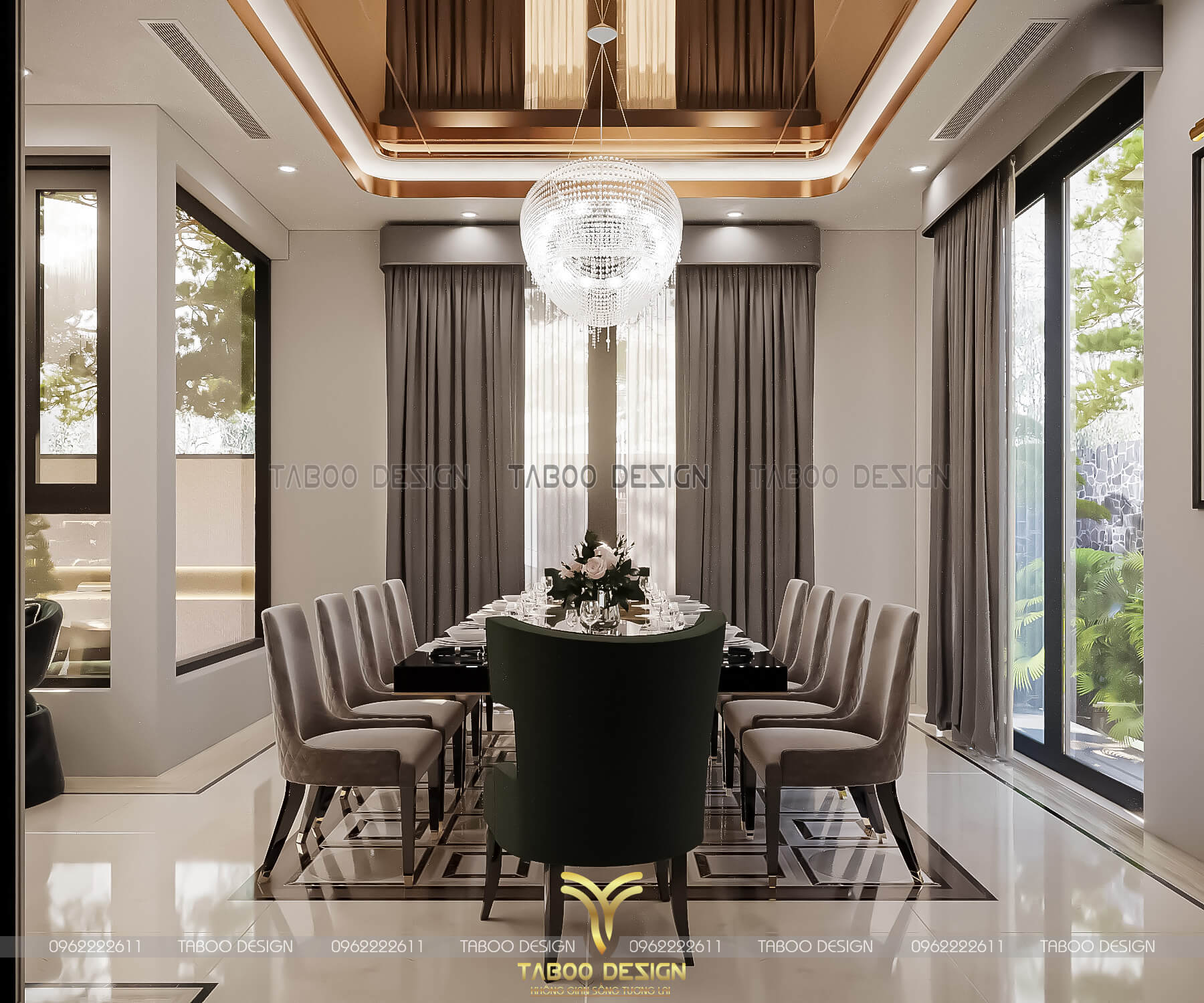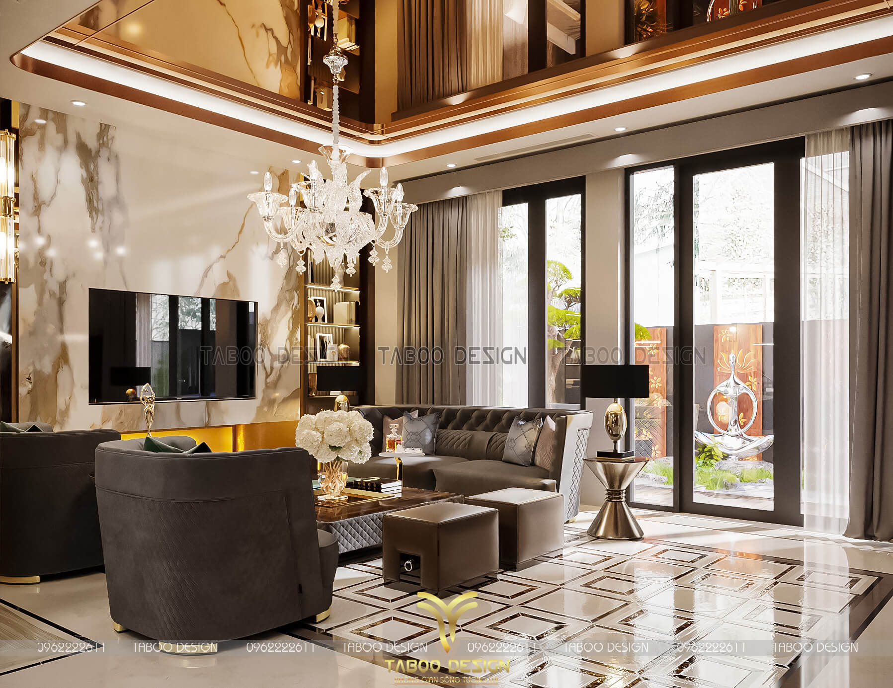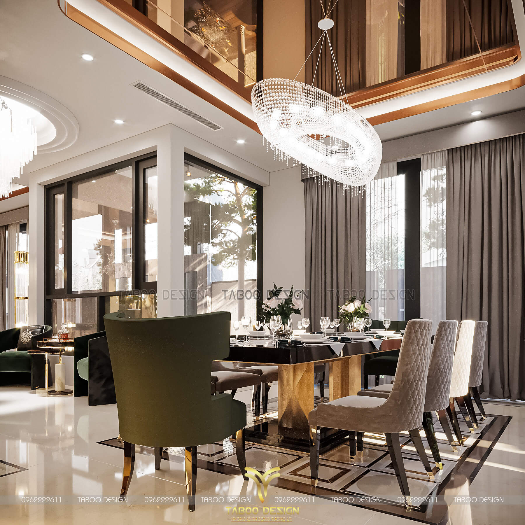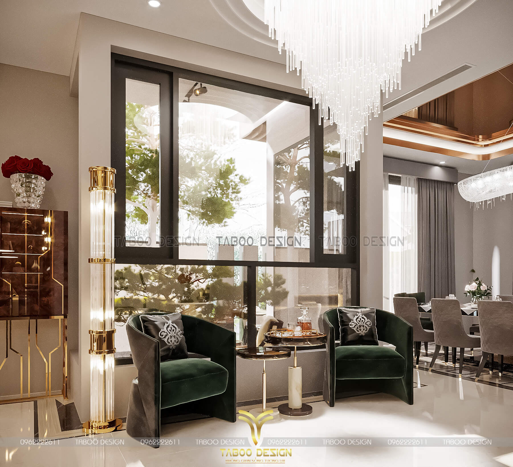 Đối với nhà hiện đại thiết kế mở là vô cùng cần thiết, tại đây hệ thống cửa kính được Taboo Design sử dụng với diện tích lớn ở các mặt biệt thự. Sử dụng xuyên suốt các mảng kính lớn từ tầng 1 đến tầng 3 giúp cho hình khối kiến trúc của căn biệt thự hiện đại nhẹ nhàng, bay bổng hơn. Giảm bớt sự nặng nề của bức tường bê tông, tiết kiệm diện tích, giảm trọng tải công trình. Toàn bộ kính được sử dụng là kính chịu lực có độ bền cao, chống chịu tốt các tác động của thiên nhiên.