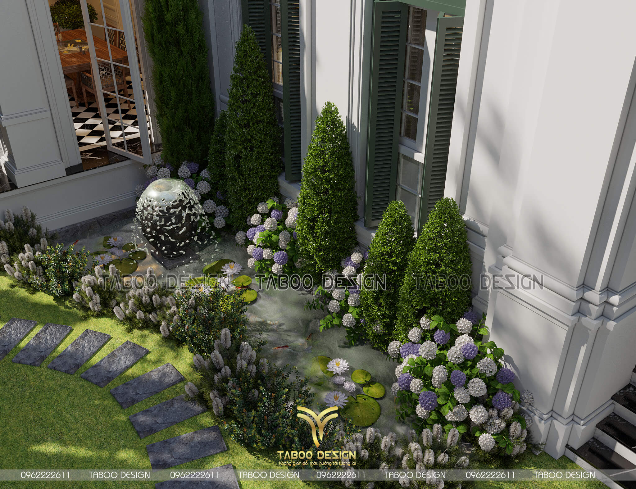 Có thể thấy rằng, KTS Taboo Design đã cùng gia chủ xây dựng nên một “mái ấm”, nơi mà các thành viên trong gia đình sẽ luôn hướng về sau những giờ làm mệt mỏi để được nghỉ ngơi trong sự an lành, gần gũi nhưng đầy tiện nghi. Không gian sống đã thể hiện rõ nét tính cách lãng mạn, nhẹ nhàng đầy thi vị của chính gia chủ. Trong không gian sân vườn, việc thiết kế tiểu cảnh bể cá không chỉ để làm đẹp mà còn có những tác động đáng kể về mặt phong thủy. Việc sắp xếp vị trí của bể cá nên tuân theo những nguyên tắc nhất định để vừa đảm bảo tính thẩm mĩ, hài hòa trong không gian công trình lại còn mang lại những điều may mắn và lợi ích về phong thủy.