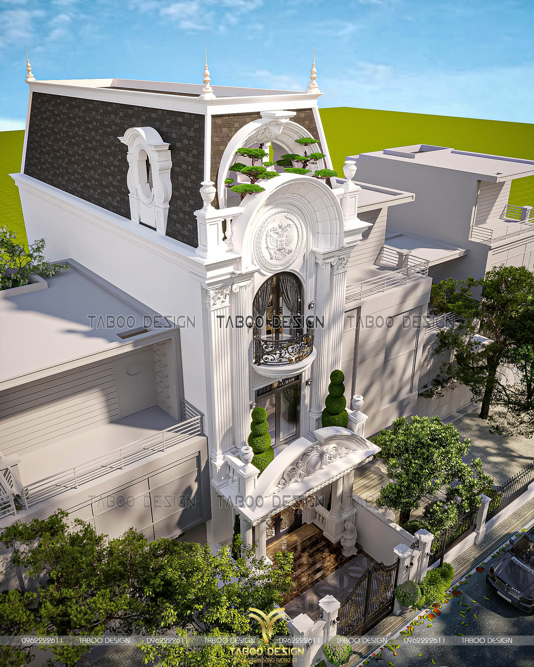 Ngoài ra, hệ thống mái sử dụng kiểu mái Marsand ngói xanh đen là kiểu mái đặc trưng của kiến trúc tân cổ điển. Không chỉ gia tăng sự bề thế cho ngôi biệt thự, mà còn giúp mở rộng không gian sử dụng của chủ đầu tư. Hệ thống mái được thiết kế như 1 tầng tum, giúp mở rộng không gian sinh hoạt tạo cho ngôi nhà phố sự bề thế, vững chãi, trường tồn mãi với thời gian. Một điểm cộng cho công trình phải kể đến mái vòm chóp với các đường phào chỉ cùng các cửa thoáng tạo điểm nhấn trang trí bắt mắt. Tất cả hòa quyện lại tạo nên vẻ đẹp sang trọng, quý phái và đầy đẳng cấp mẫu nhà đẹp này.