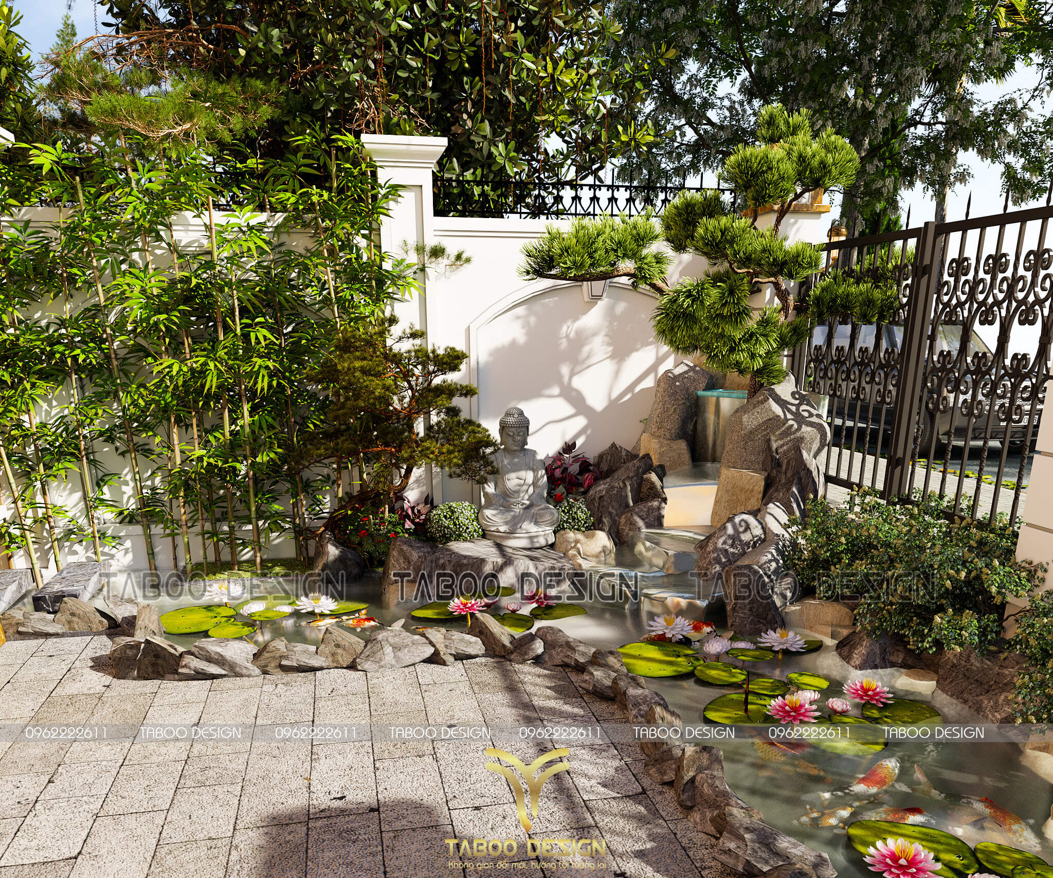 Tiểu cảnh sân vườn sân trước với hệ thác nước kết hợp với bể cá Koi