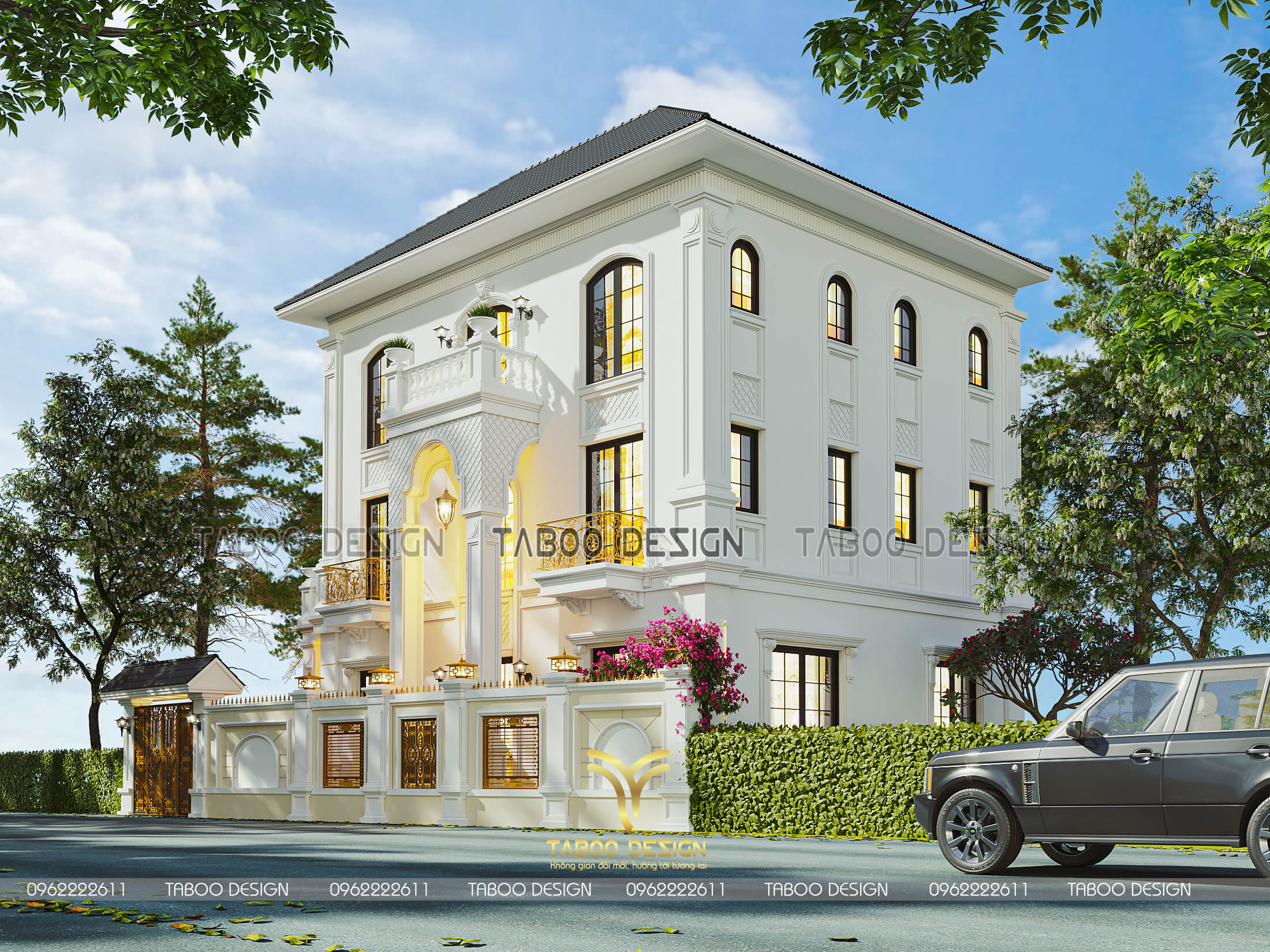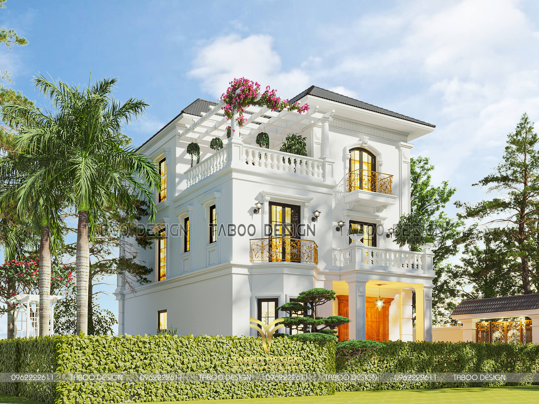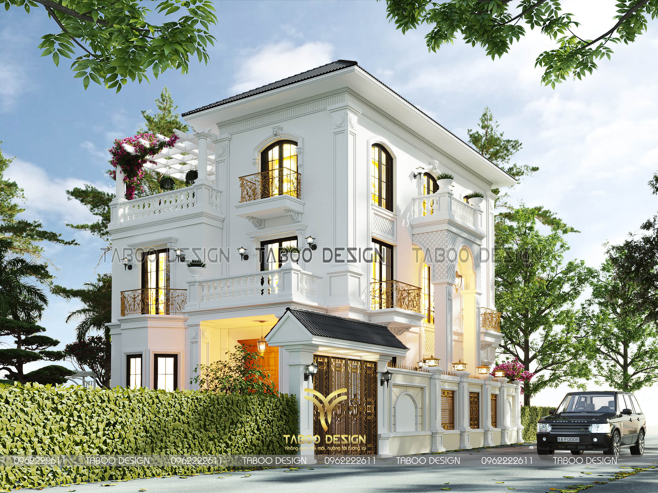 Điểm đặc biệt được yêu thích ở kiến trúc biệt thự tân cổ điển này là sự thích dụng về mỹ quan: kiến trúc tân cổ điển không quá chú trọng vào hoa văn, phào chỉ phức tạp mà chọn họa tiết tinh túy, điển hình nhất làm nhấn lên vẻ sang trọng, đẳng cấp vững bền cùng thời gian. Sử dụng gam màu sơn trắng được lựa chọn làm tone màu chủ đạo ăn nhập với mặt tiền biệt thự thoáng, rộng được thiết kế theo lối hoàng gia châu Âu càng tô thêm vẻ trang nhã, tráng lệ cho căn biệt thự.