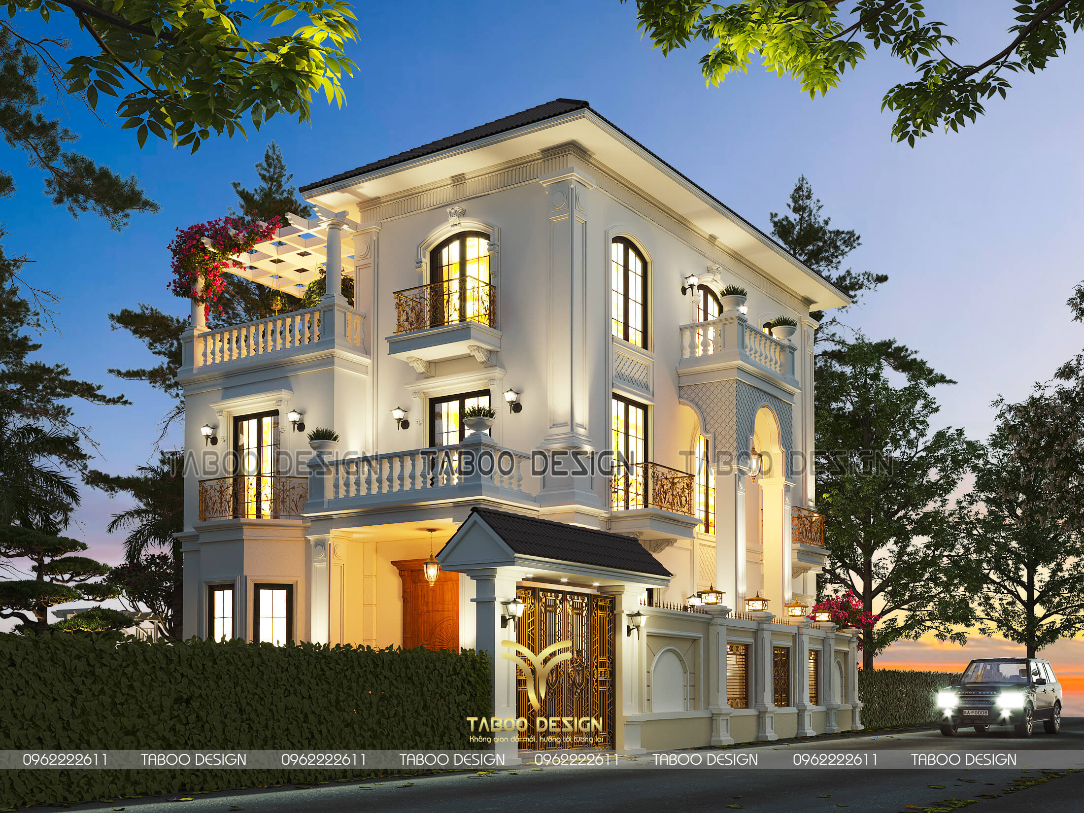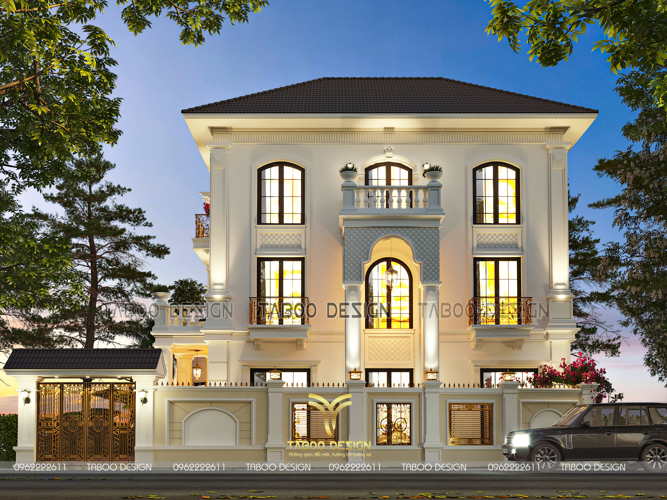 Phối cảnh ban đêm biệt thự tân cổ điển với hệ thống ánh sáng lung linh huyền ảo