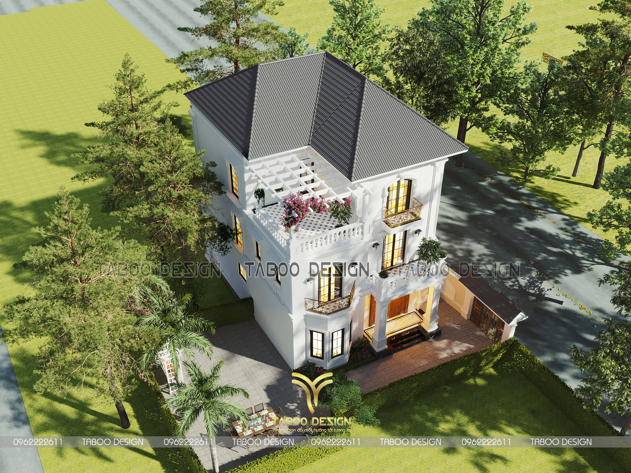 Phối cảnh tổng thể mẫu biệt thự 3 tầng 5 phòng ngủ khi nhìn từ trên cao