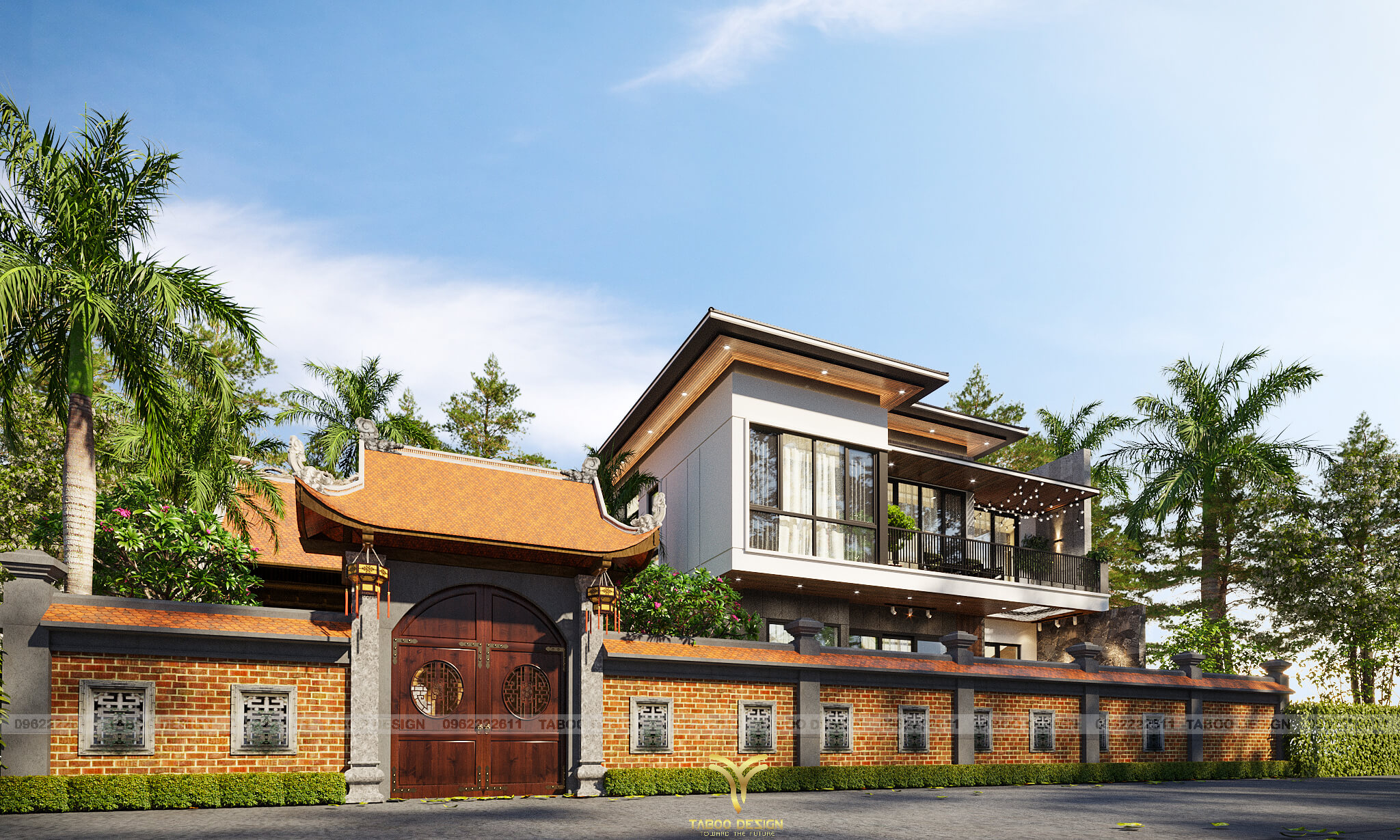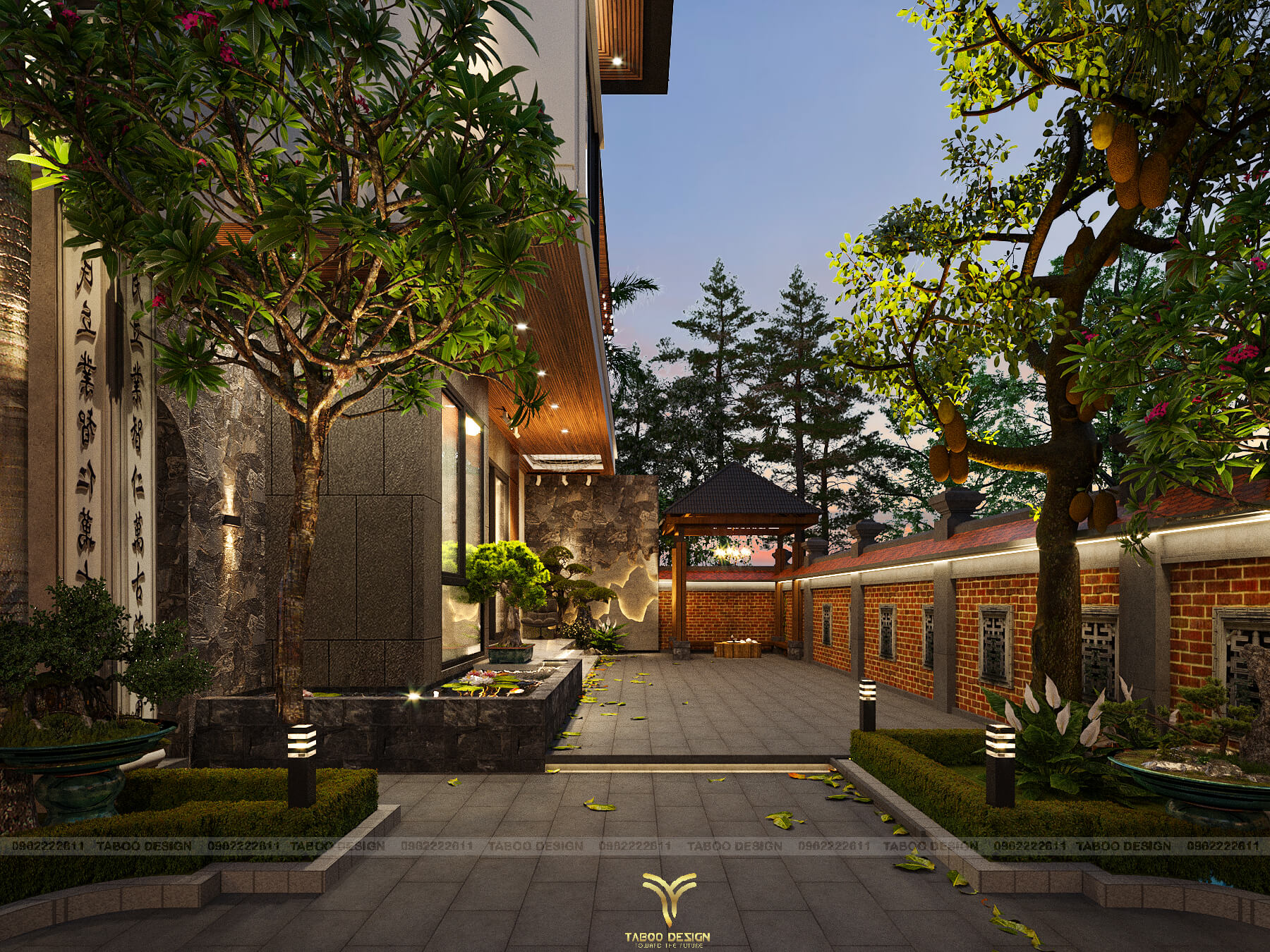 Đảm bảo cho phần không gian mẫu từ đường kết hợp nhà ngang được riêng tư, hệ tường rào được xây dựng kiên cố, mặt tường trước tạo hình chữ “Thọ” đan xen các đường họa tiết tĩnh xảo uốn lượn mềm mại như lời mong cầu gia đình được hạnh phúc trường thọ, bền lâu. Cùng với ý nghĩa mong cầu đó không chỉ đơn thuần là việc bố trí tạo thêm cảnh sắc mà còn mang đến ý nghĩa lớn trong phong thủy. Ba cây cau vua được trồng ngay chính sân tượng trưng cho sự may mắn, tài lộc với tính năng ưa ánh sáng, điều hòa không khí và tạo bóng tốt.