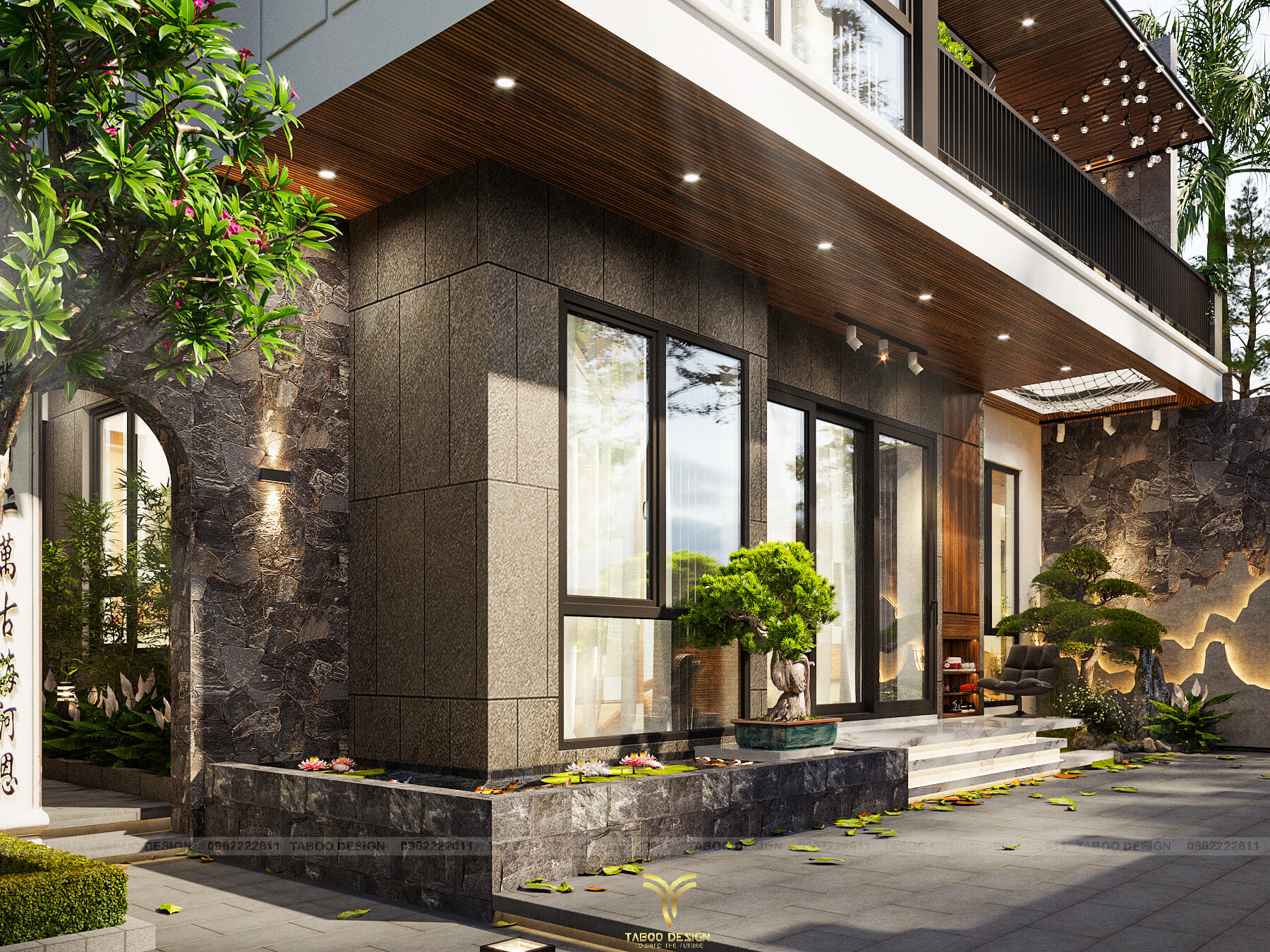 Bên cạnh đó, phần trước nhà là khoảng sân rộng được lát đá đen Thanh Hóa sạch sẽ cùng hệ thống bồn cây nhỏ bao quanh chân tường mang đến mảng xanh, tạo sự xanh mát cho biệt thự 2 tầng hiện đại.