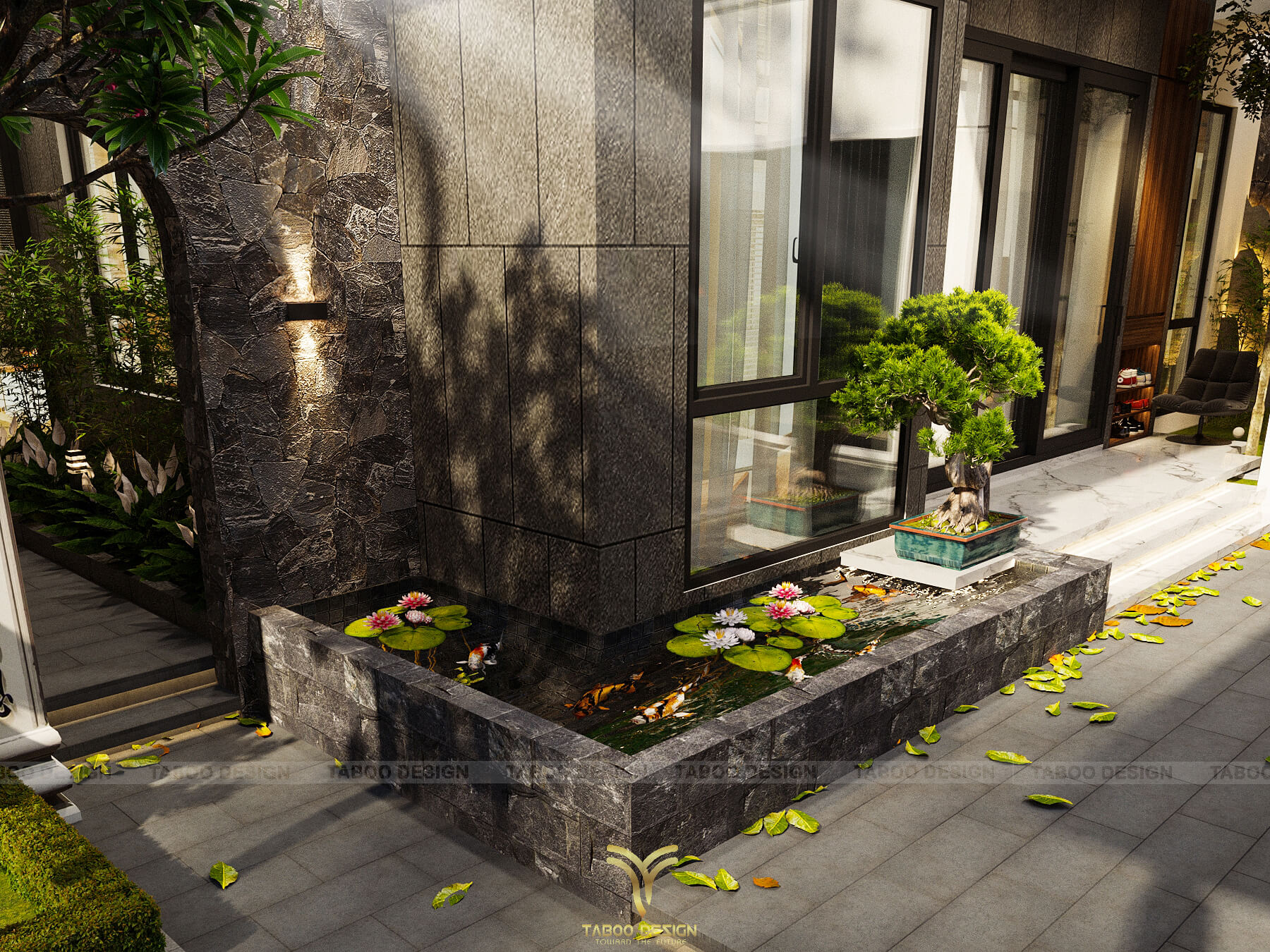 Bể cá Koi - Điểm nhấn sân trước của biệt thự hiện đại 2 tầng