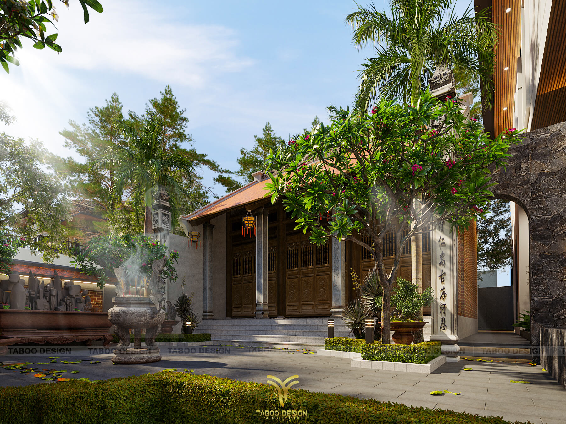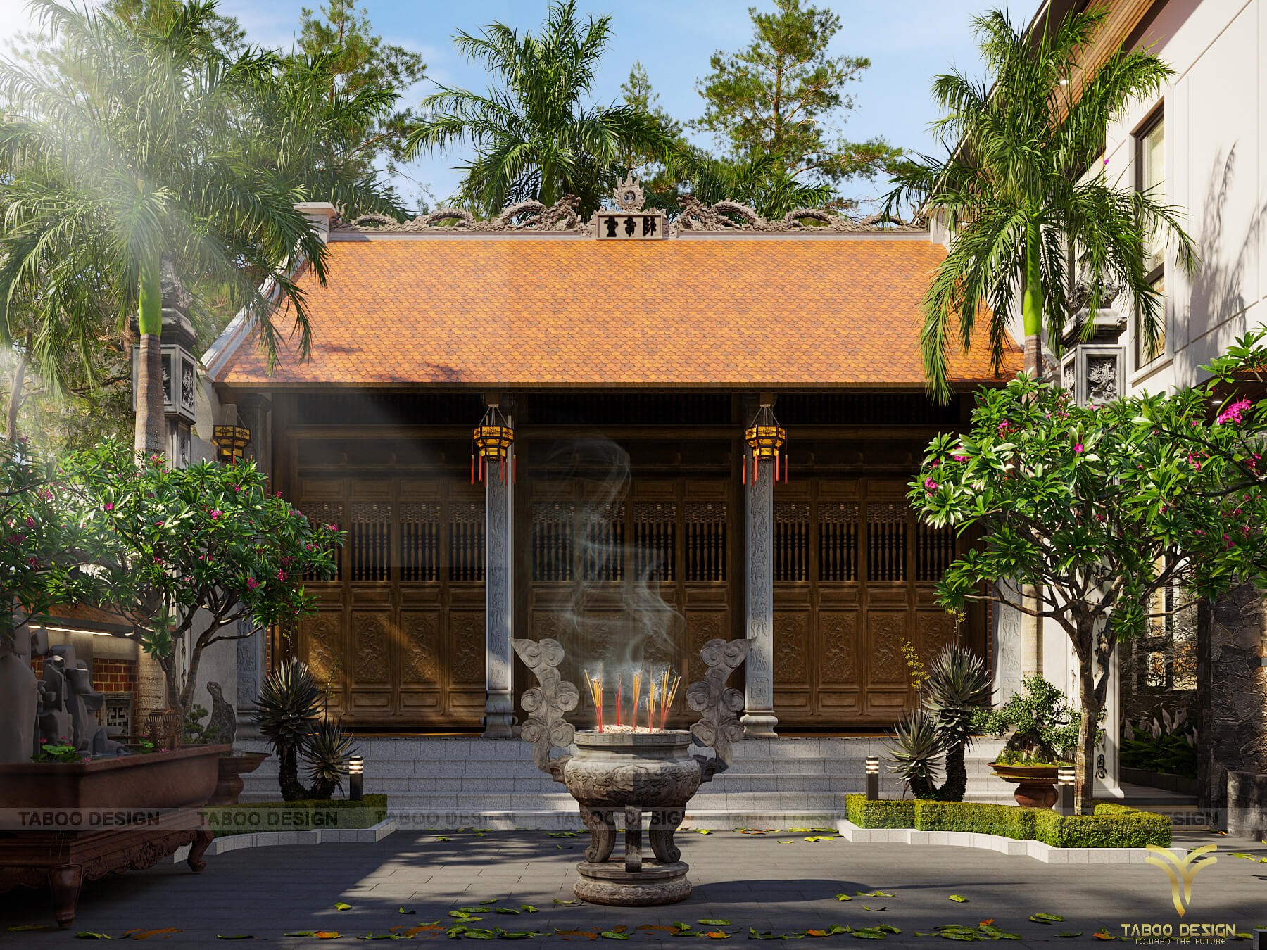 Mẫu từ đường kết hợp nhà ngang tọa lạc trong khuôn đất vuông vắn, tổng thể công trình với hai khu vực chính là từ đường và dãy nhà ngang đảm bảo công năng cũng như tiện nghi trong nhu cầu sử dụng của gia chủ. Đan xen trong những lớp ngói đỏ là hàng cây xanh thắm khoe sắc giữa trời, mang đến sinh khí tươi tốt cho khuôn viên, không những vậy còn vẽ thêm màu sắc sinh động cho bức tranh phong cảnh huyền diệu.