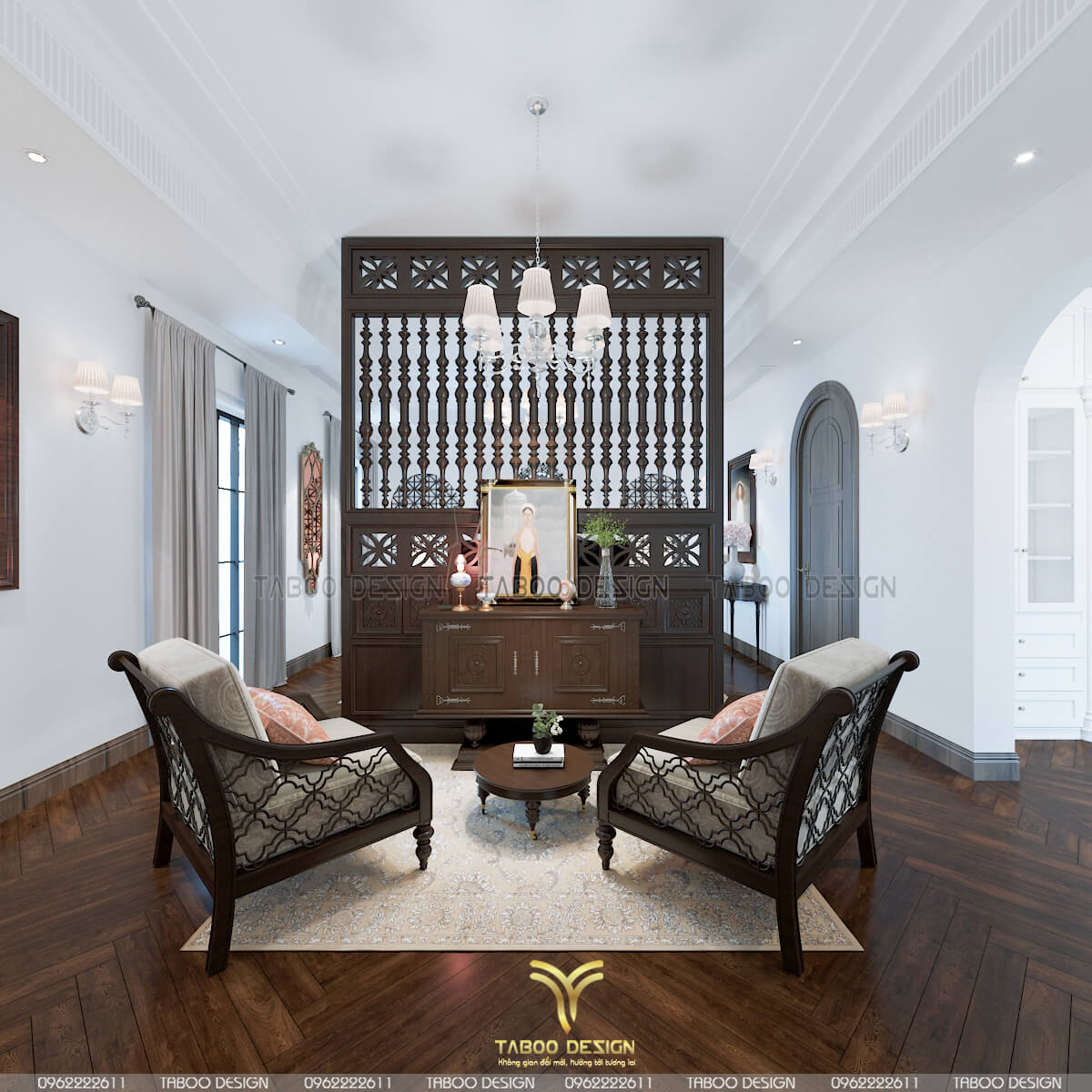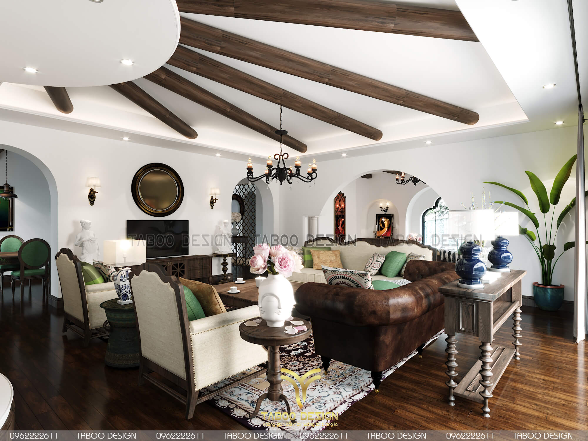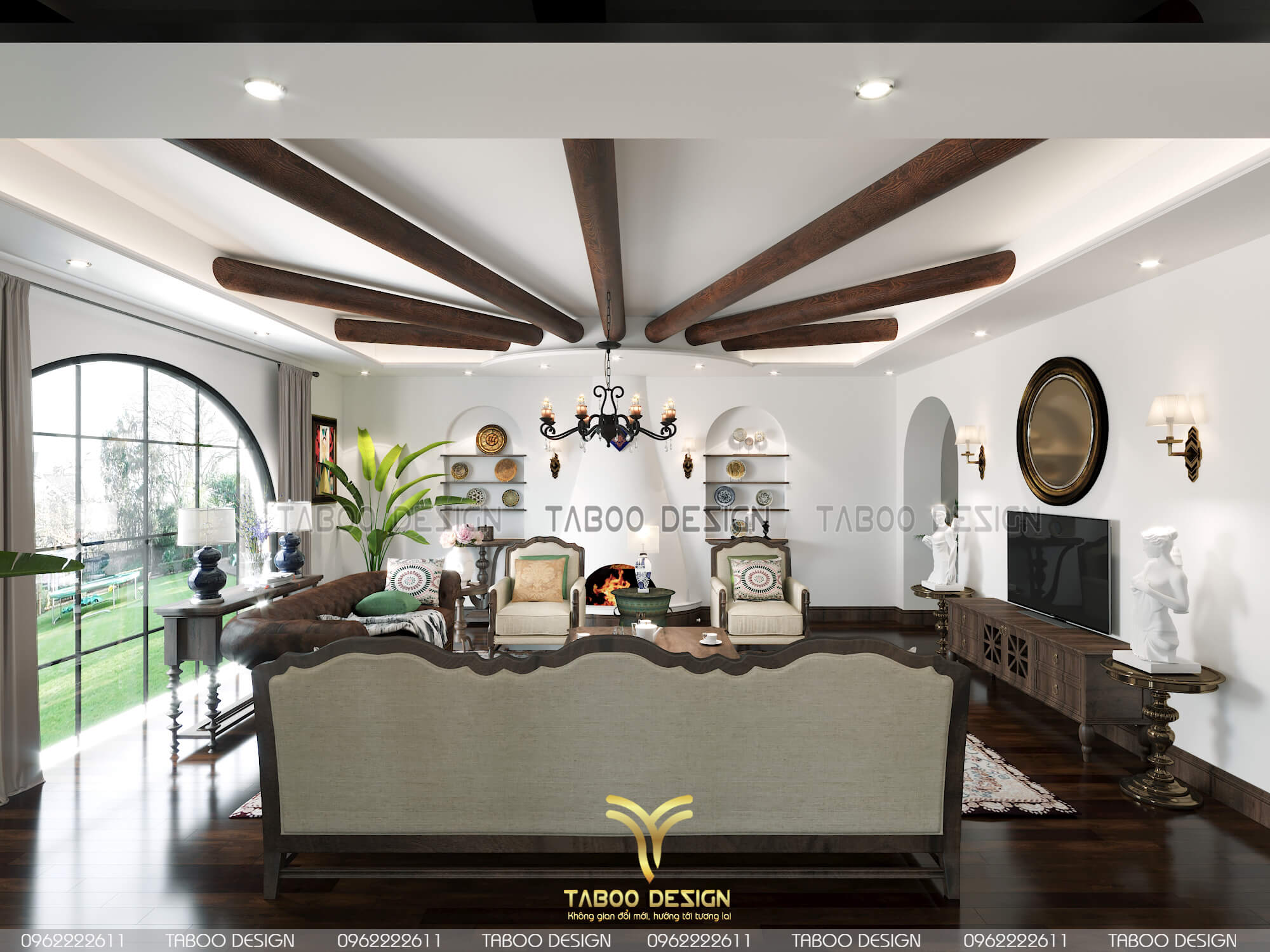 Nổi bật ở phòng khách là hệ trần có thiết kế kết hợp giữa thạch cao và gỗ rất độc lạ cùng với hệ lò sưởi giả. Bộ sofa phong cách Địa Trung Hải với thiết kế có tính cân bằng cao, từ chất liệu, khung, bọc sofa. Kiểu dáng sofa ấn tượng, tinh tế mang theo nét truyền thống nhưng lại không hề có cảm giác lỗi mốt, xưa cũ. Khung ghế của sofa được làm bằng gỗ tự nhiên, chúng có độ bền cao, độ chịu lực tốt và sử dụng lâu bền theo thời gian.