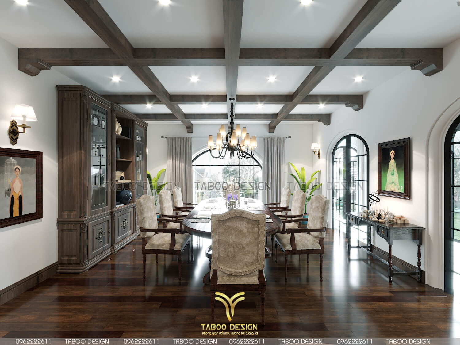 Bộ bàn ăn 8 người với thiết kế khung gỗ bọc đệm vải, bàn ăn khối gỗ vuông lớn với đường vân gỗ đẹp mộc mạc. Bên cạnh hệ thống đèn âm trần chiếu sáng thì để tăng lên không gian thoáng rộng hơn, các KTS đã thiết kế hệ thống cửa kính lớn ở 2 bên diện tường. Thiết kế rèm cổ điển 2 lớp đồng điệu với màu sắc chung vô cùng bắt mắt.