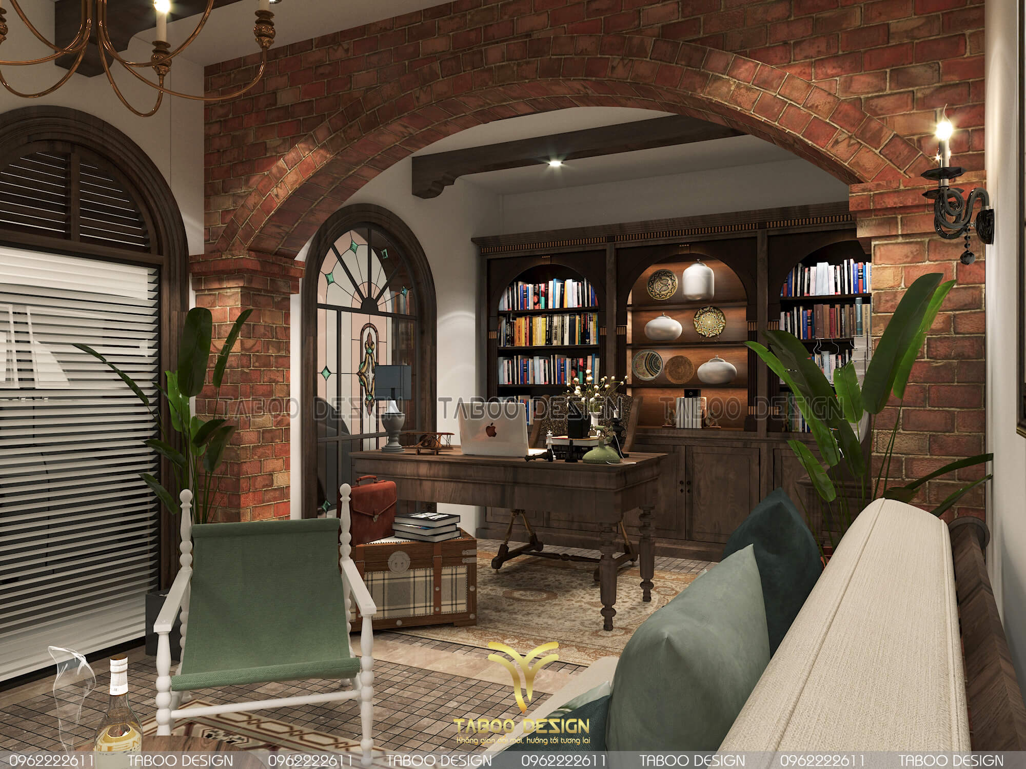 Sự kết hợp giữa gỗ, gạch giả cổ, gạch thẻ mang đến cho không gian phòng làm việc sự hoài cổ, cuốn hút