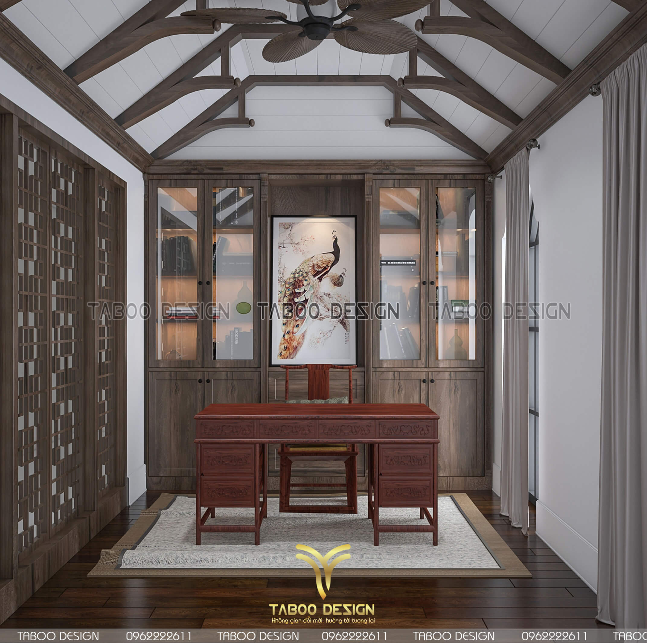 Không gian thư phòng được thiết kế đơn giản nhưng vẫn giữ được sự tinh tế, trang nhã