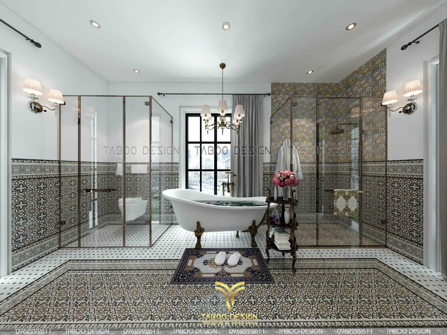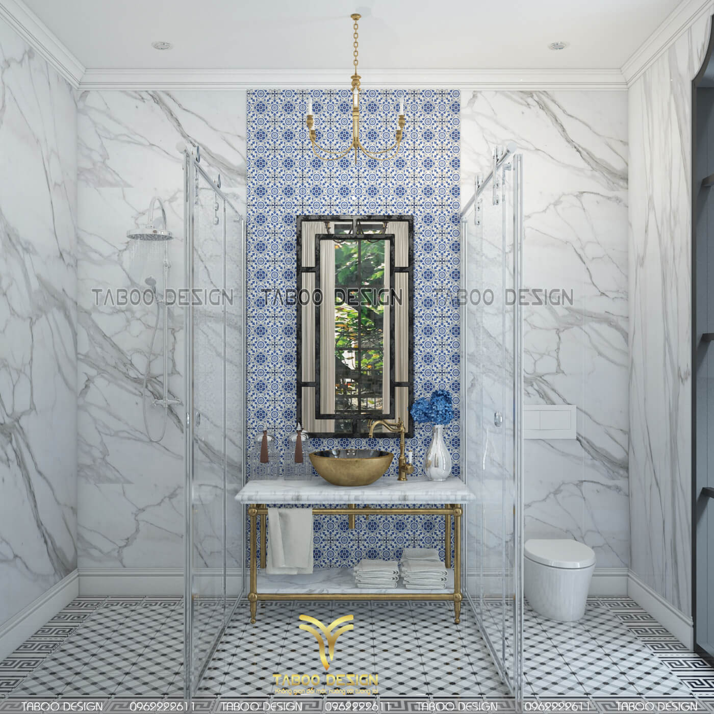 Nét đặc trưng của phòng WC phong cách Địa Trung Hải đó là những nền gạch hoa bởi chúng mang đến nét đẹp hoài cổ đặc trưng của phong cách Địa Trung Hải. Tổng thể với các thiết kế nội thất hiện đại tuy nhiên màu sắc cũng như đường nét lại gợi về quá khứ đã qua, khiến lòng người thấy trong lòng nhẹ lại, thư thái và bình yên hơn.