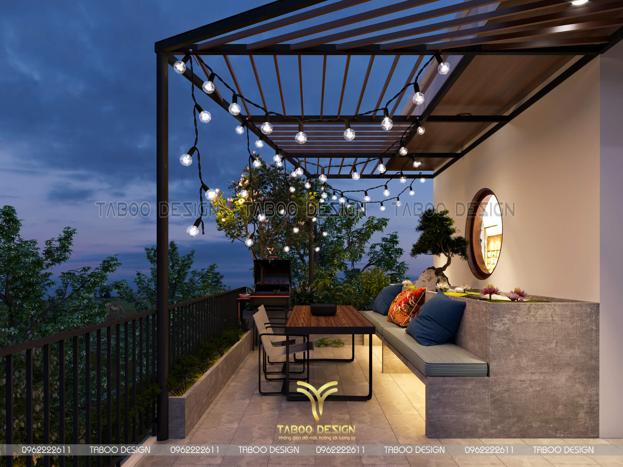 Phối cảnh ban công sân thượng bố trí nướng BBQ lãng mạn