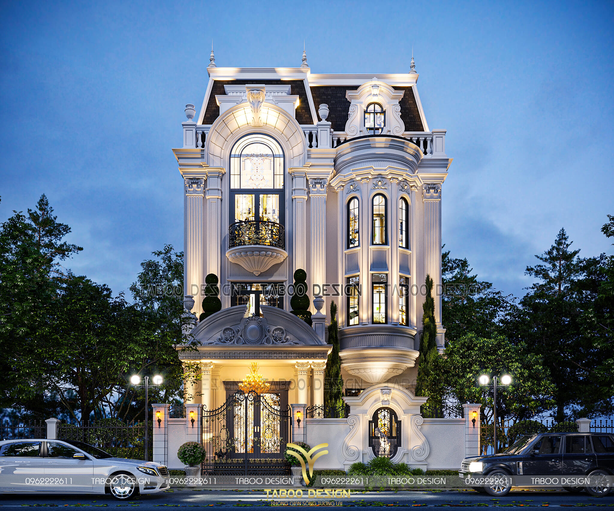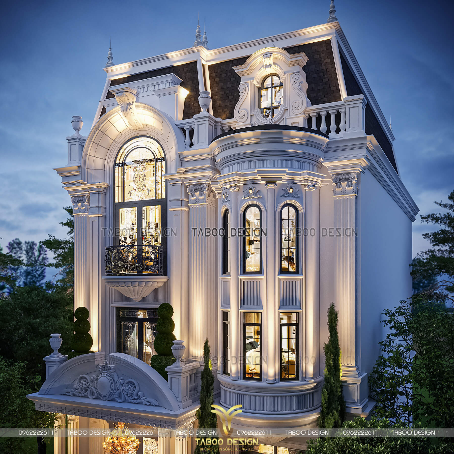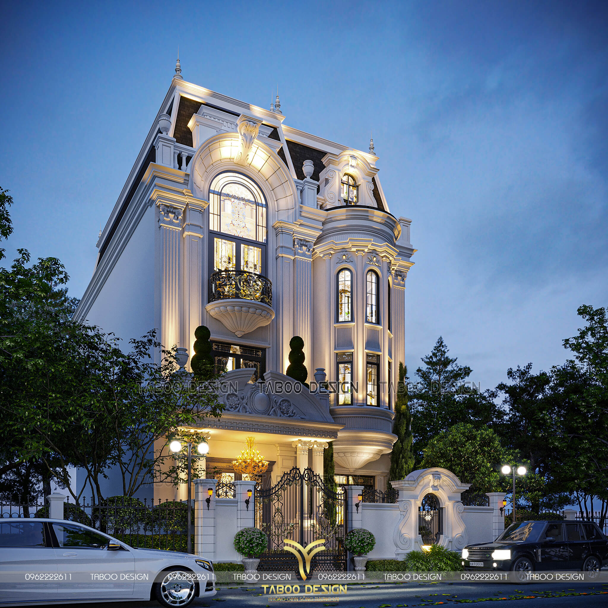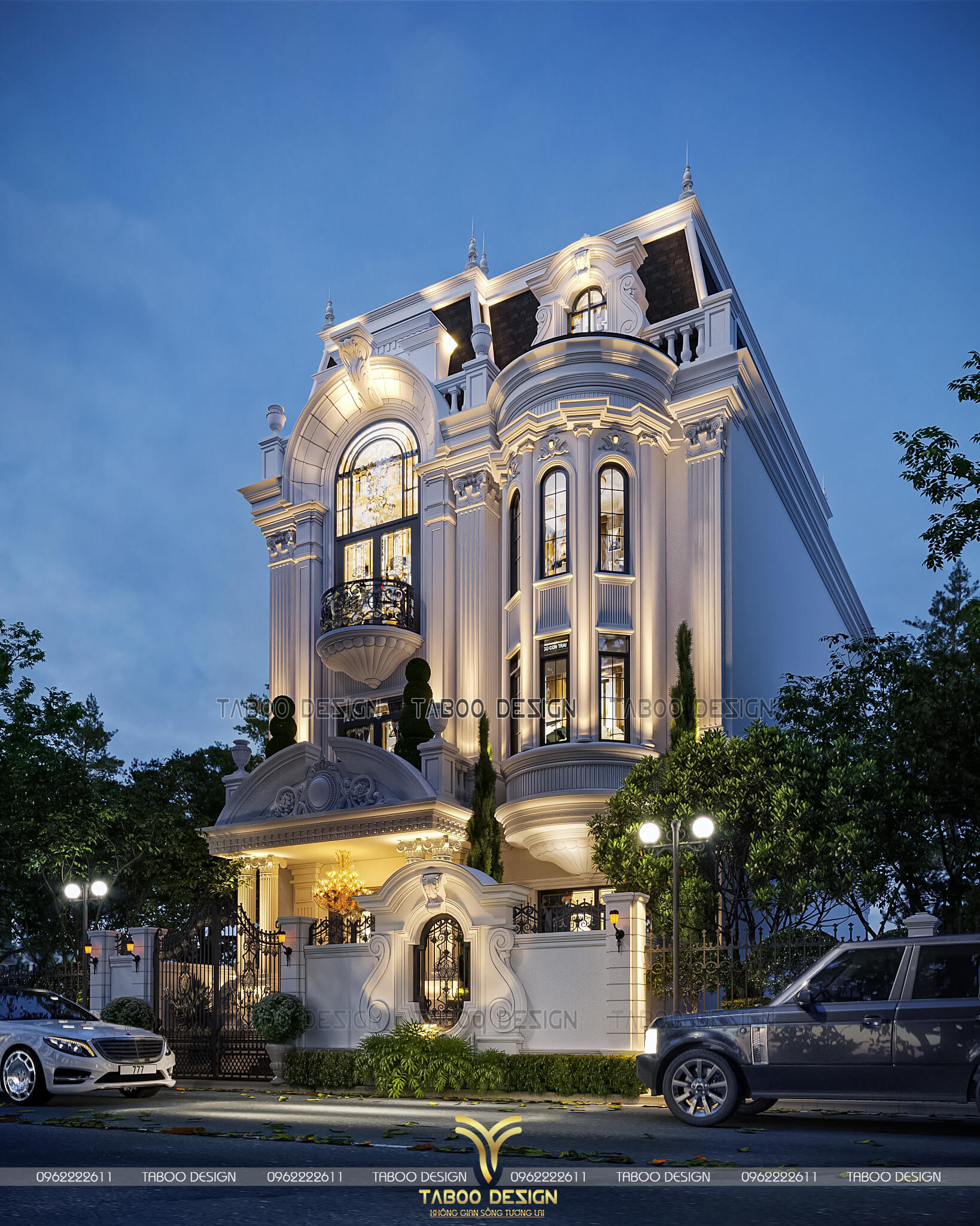 Phối cảnh ban đêm mẫu thiết kế biệt thự tân cổ điển 3 tầng