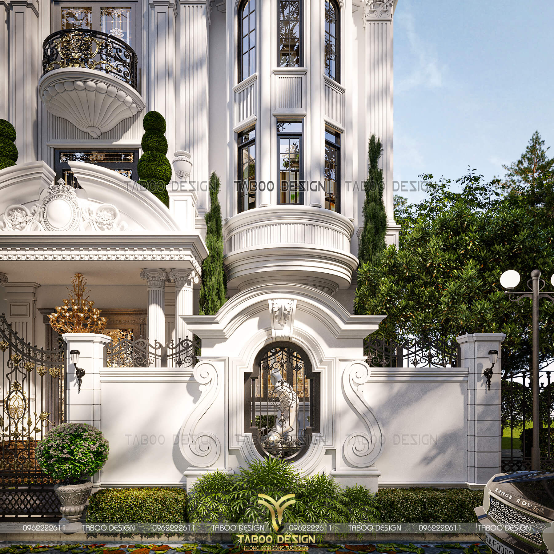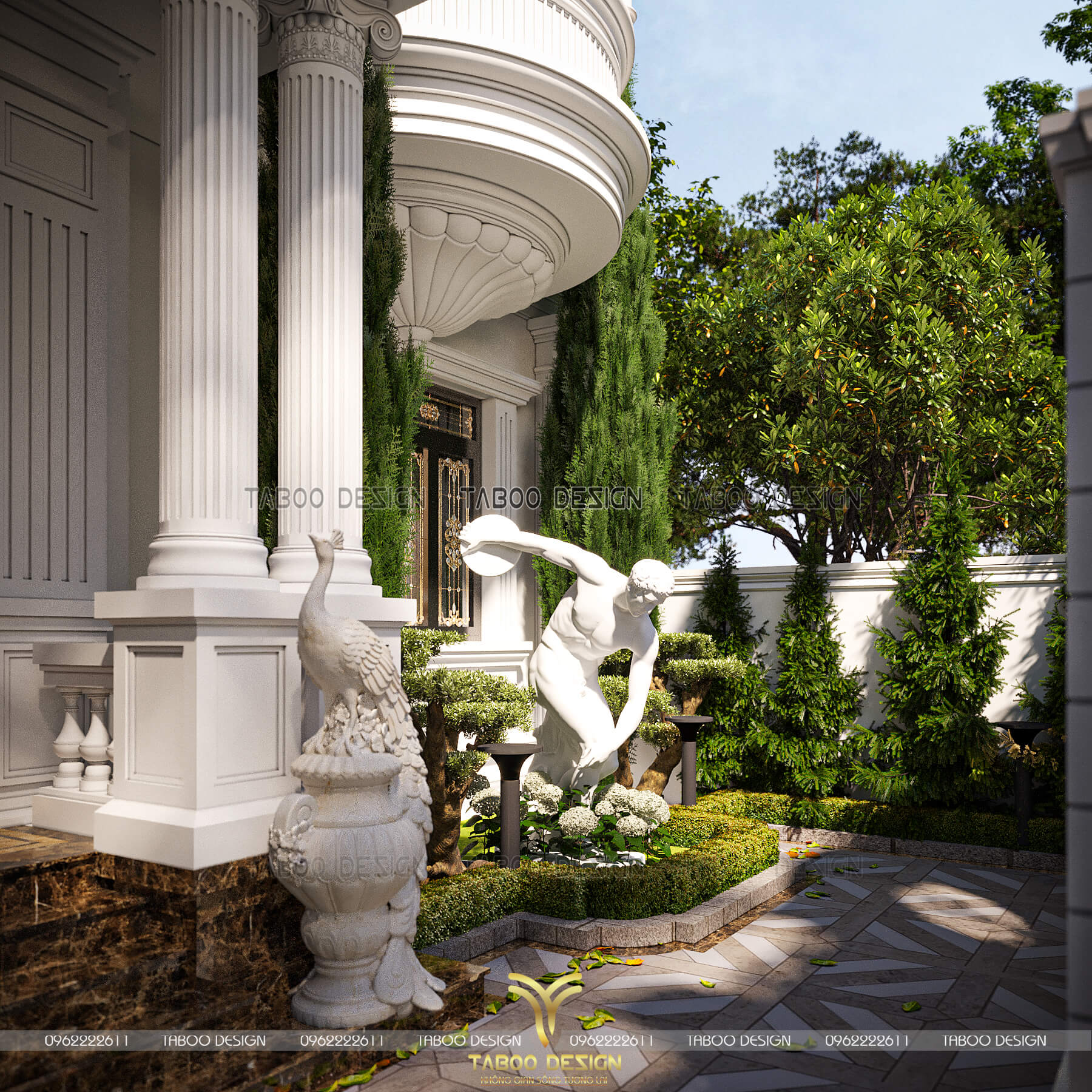 Phối cảnh không gian sân vườn trước mặt tiền biệt thự tân cổ điển 3 tầng