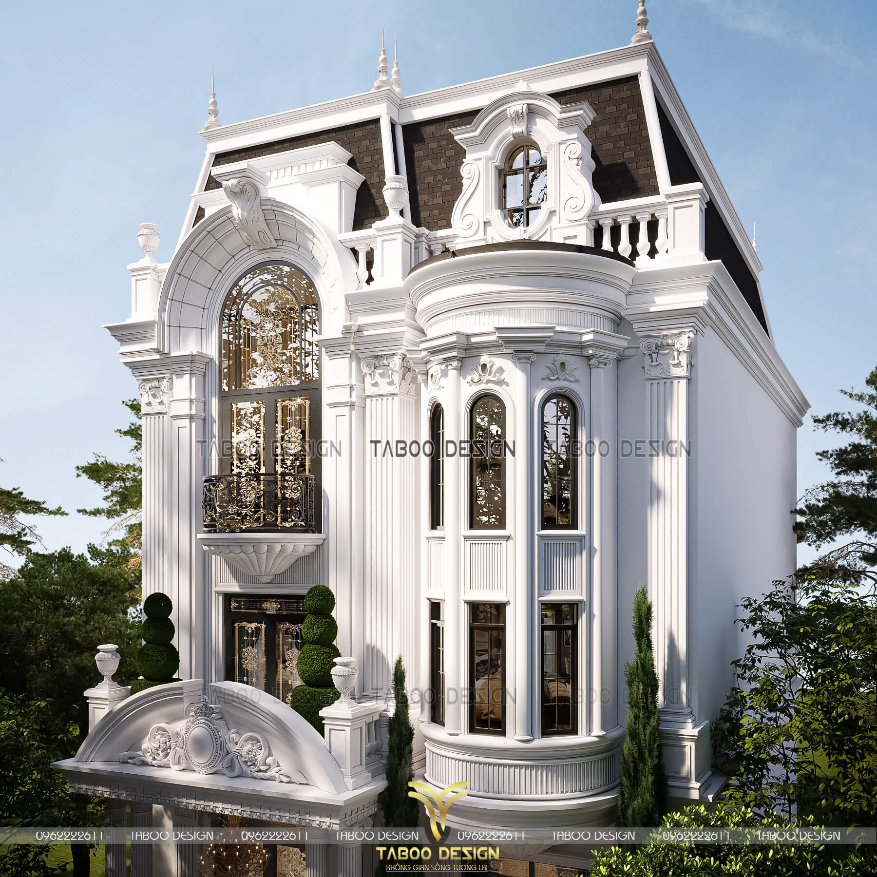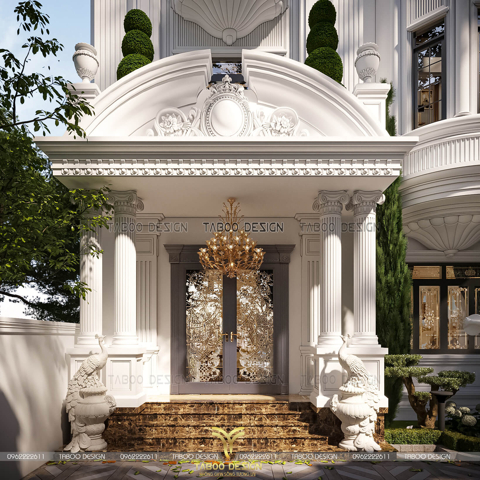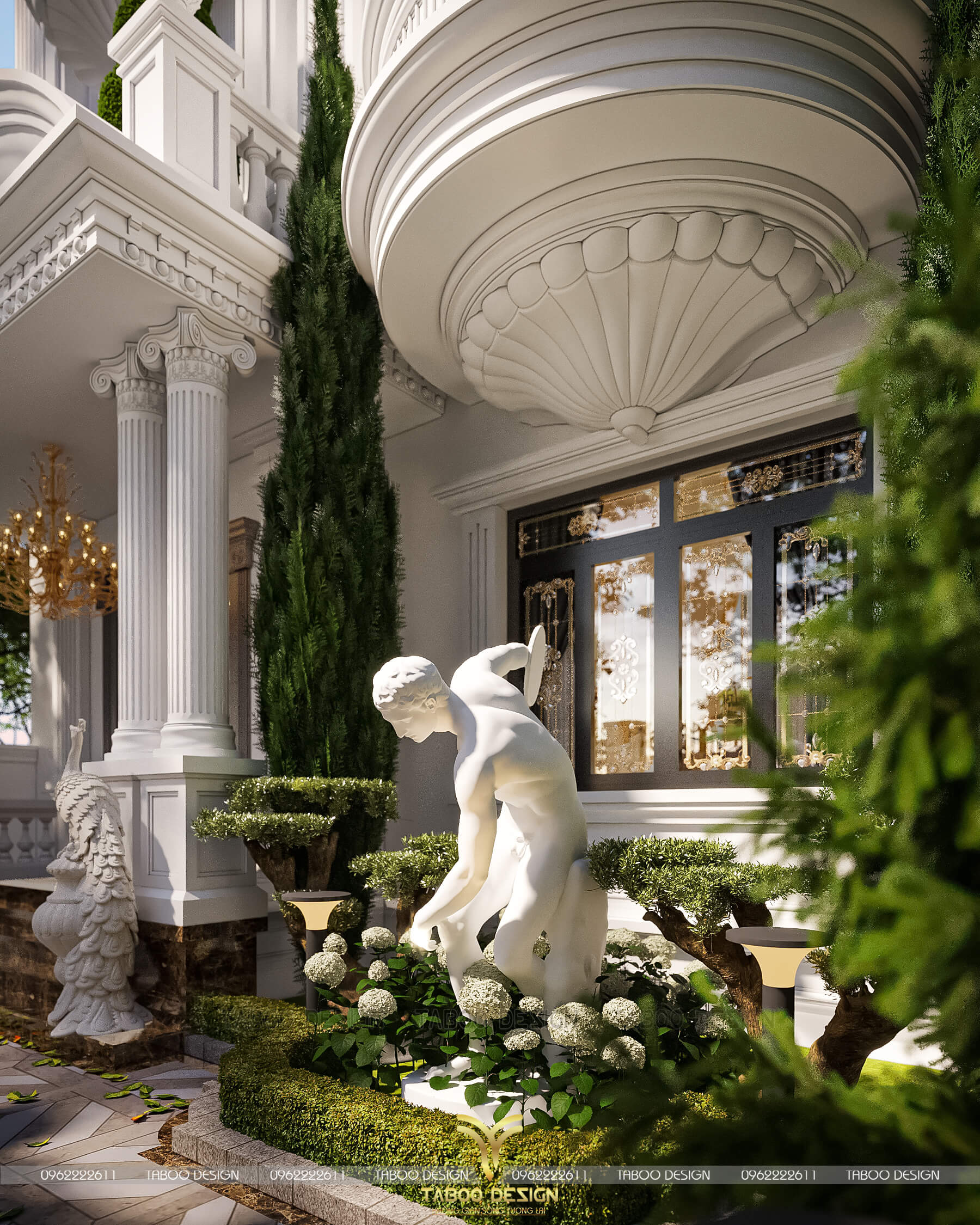 Không chỉ dừng lại ở việc chăm chút cho mặt tiền sảnh chính, để tổng thể trở nên hài hòa hấp dẫn, các KTS của Taboo Design đã thiết kế trụ cột vuông ốp sát tường nối thông tầng từ tầng 2 lên mái cùng mái vòm cong lùi sâu tạo độ vát cùng bức trướng hình bông hoa hướng mặt trời rất nổi bật. Các đường phào giật cấp nhẹ nhàng nơi đầu cột, các cửa sổ,... cũng là một điểm nhấn thể hiện được sự sắc nét cho tổng thể công trình.
