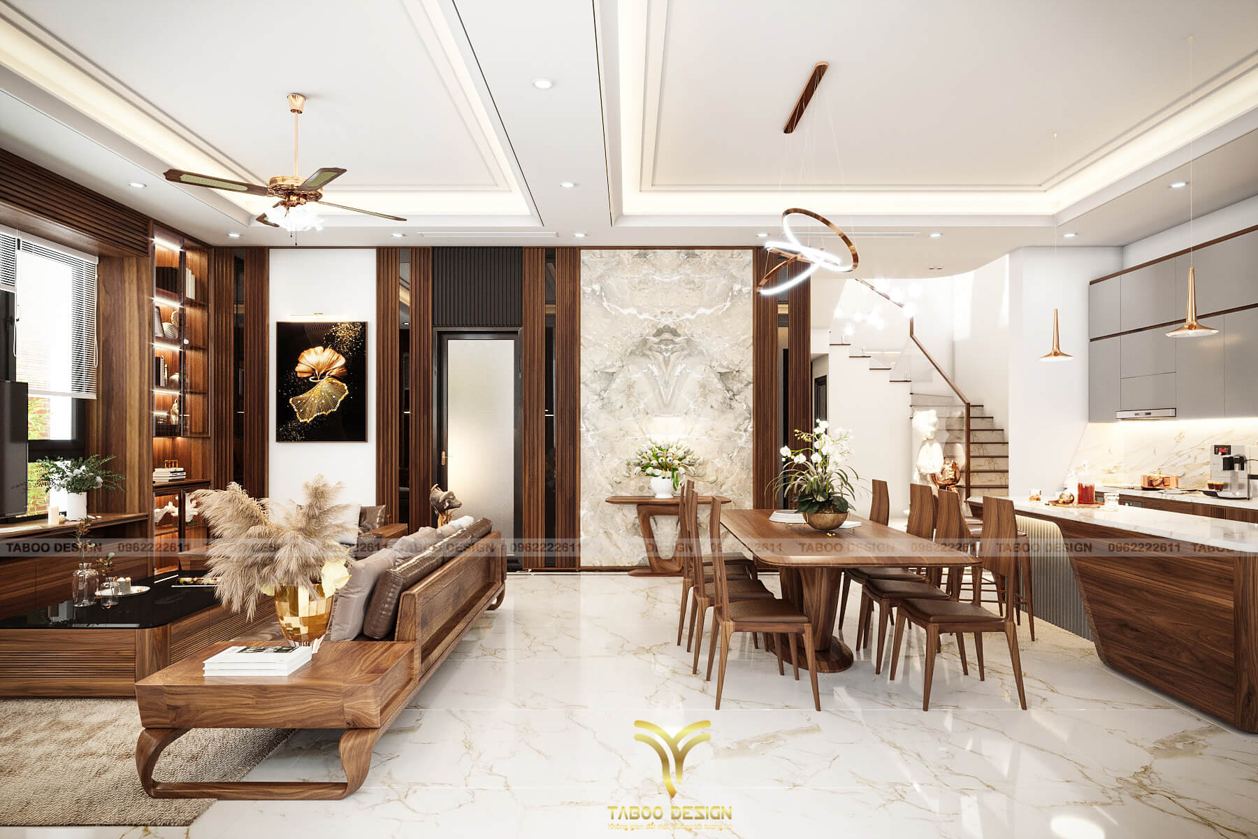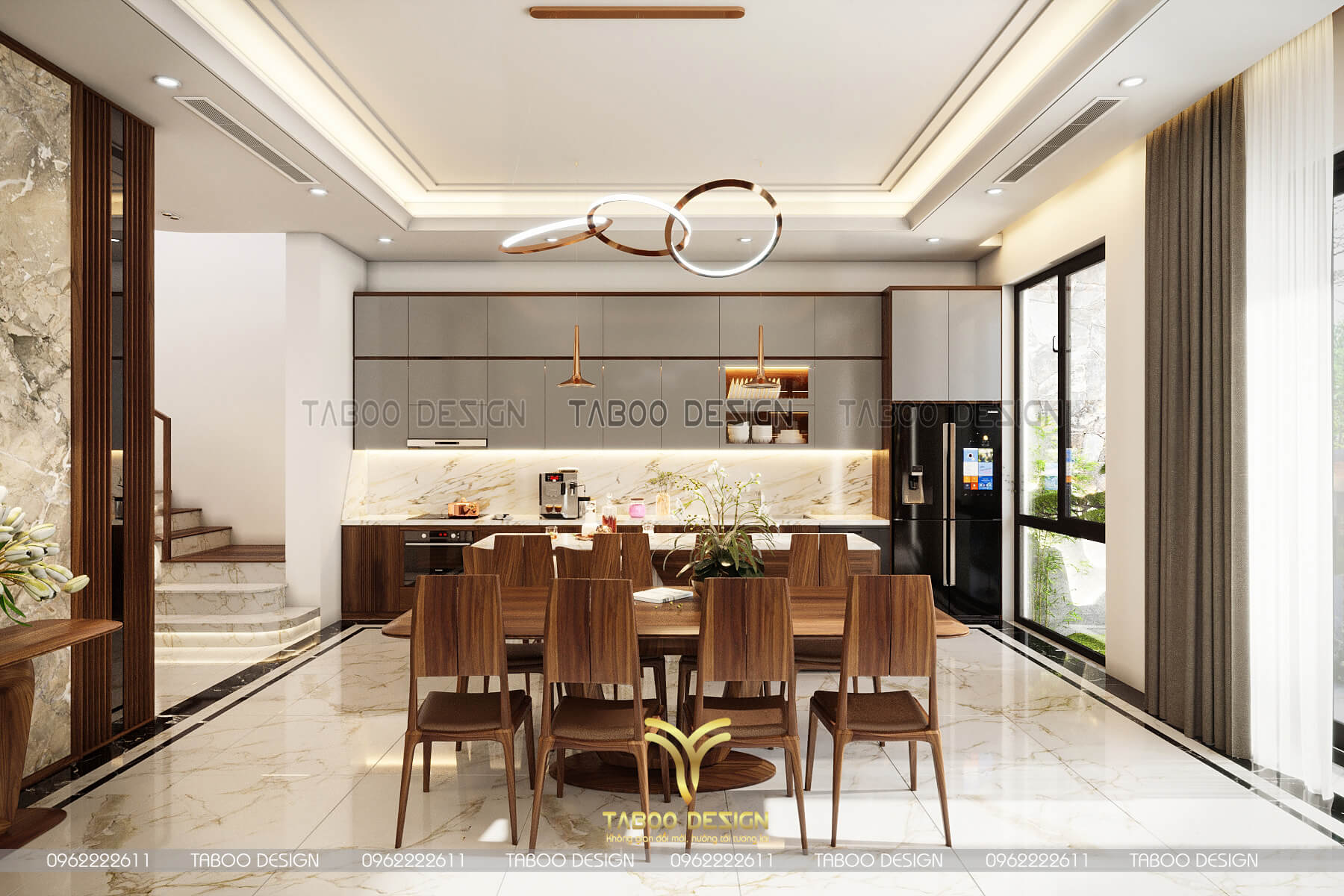 Với nhịp sống ngày càng hối hả như ngày nay thì nhà bếp chính là nơi "giữ lửa - truyền lửa" hạnh phúc của mỗi gia đình. Hiểu được điều đó, Taboo Design đem đến không gian nhà bếp với gỗ gõ đỏ bền, sang trọng và tạo không gian ấm cúng. Ngoài ra, hệ thống các thiết bị nhà bếp thông minh, hiện đại cũng như được chú trọng như: máy hút khói, tủ lạnh, bếp từ, lò vi sóng,... Đảm bảo tối đa về công năng sử dụng.