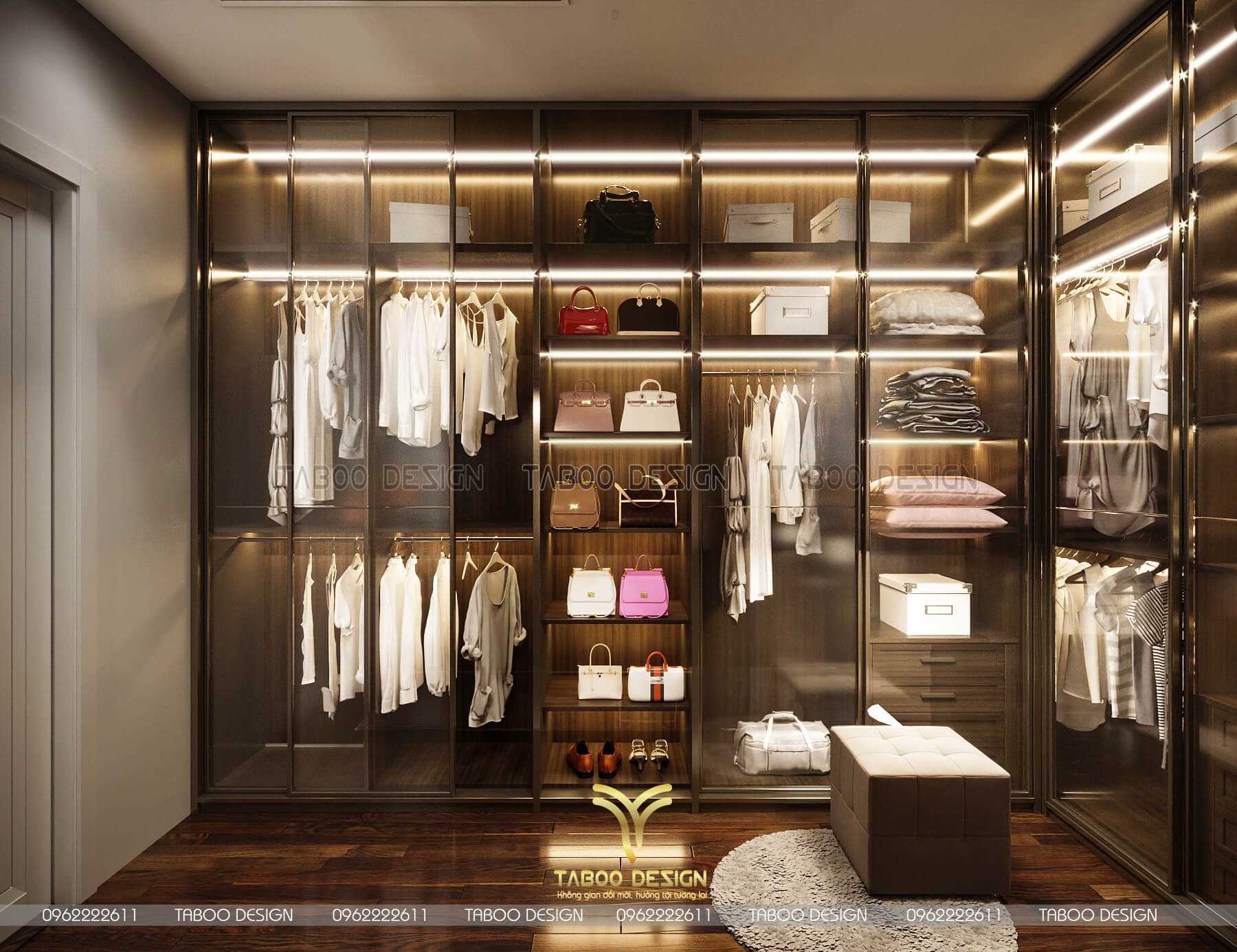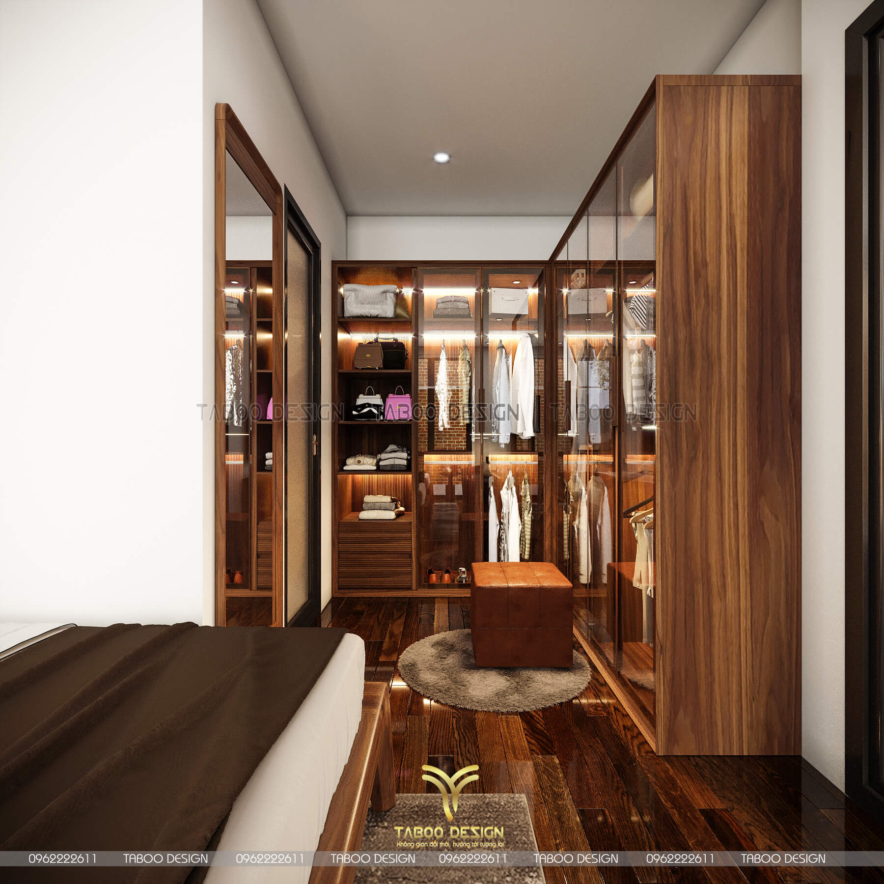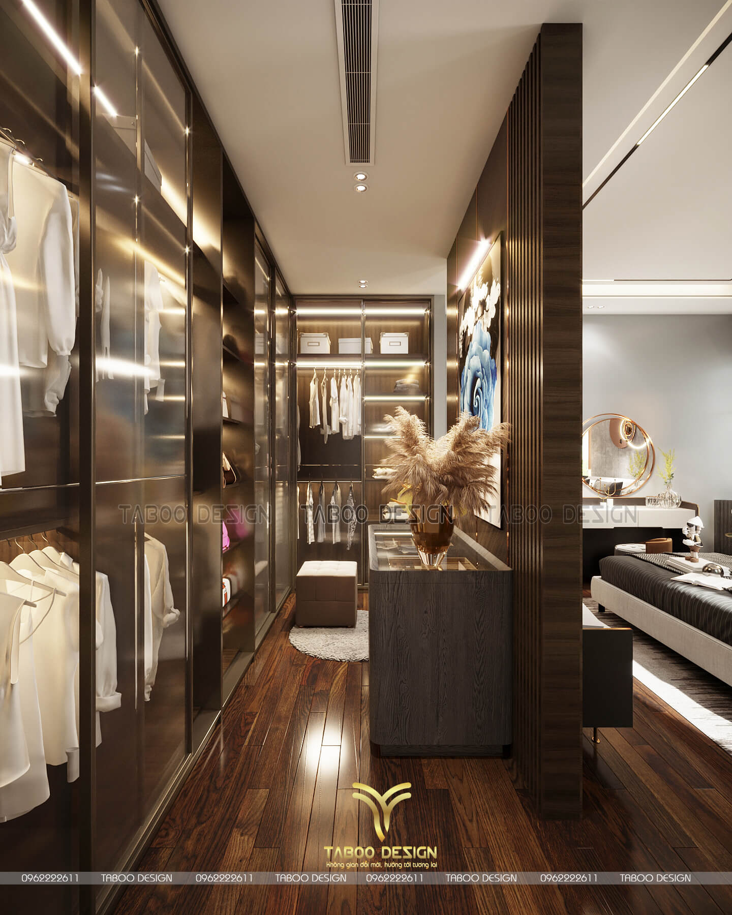 Không gian thay đồ với hình thức tủ sử dụng gỗ tự nhiên với cánh kính full viềng