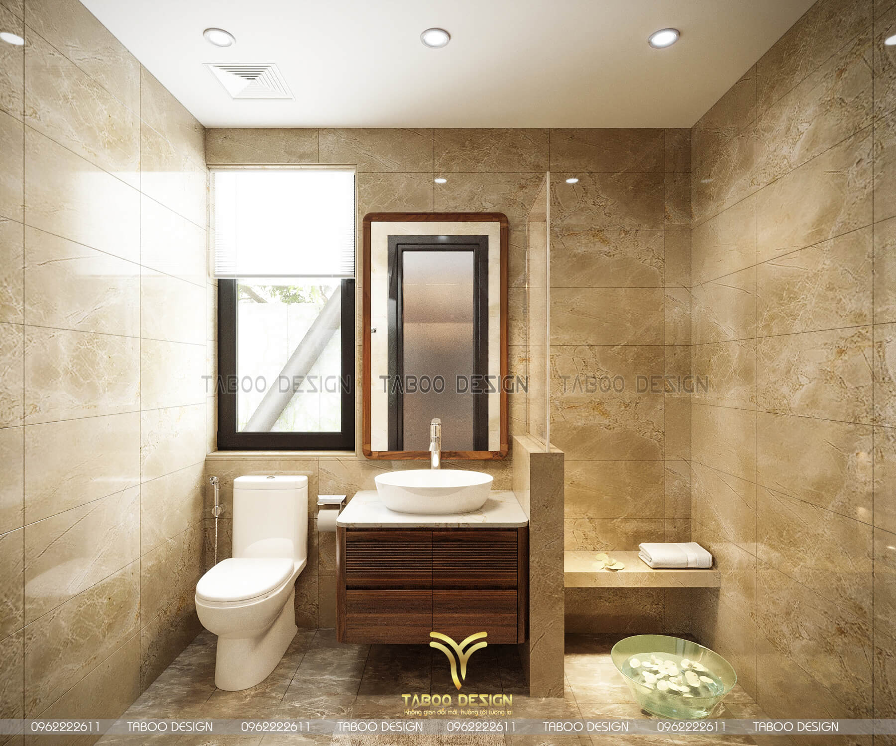 Phòng vệ sinh được thiết kế và sử dụng vật liệu xây dựng như lát gạch và đã có vân mây, sẽ tạo cho phòng tắm rộng hơn. Phòng tắm và bồn tắm được thiết kế tách riêng sẽ giúp ngăn cách với khu vực khô và ướt, bệ xí được thiết kế theo phong cách châu âu nên dính trên tường sẽ tạo được sự thích thú và sự gọn gàng, sạch sẽ khi lao dọn.
