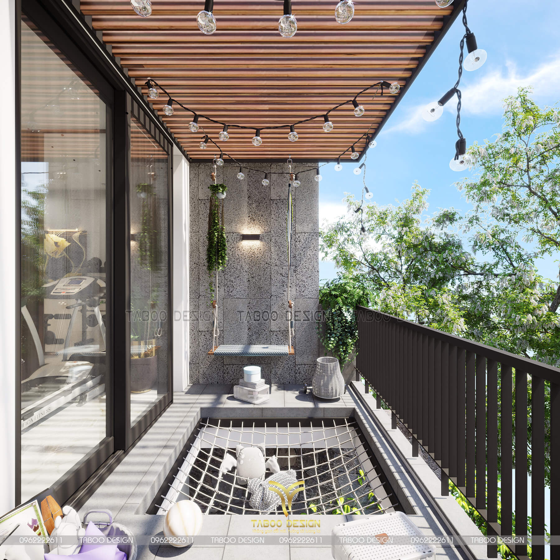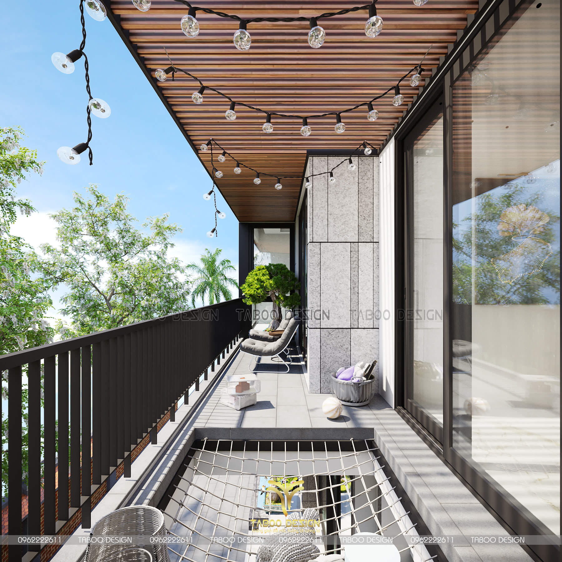 Không gian ban công thưởng trà và cho các con nhỏ vui chơi