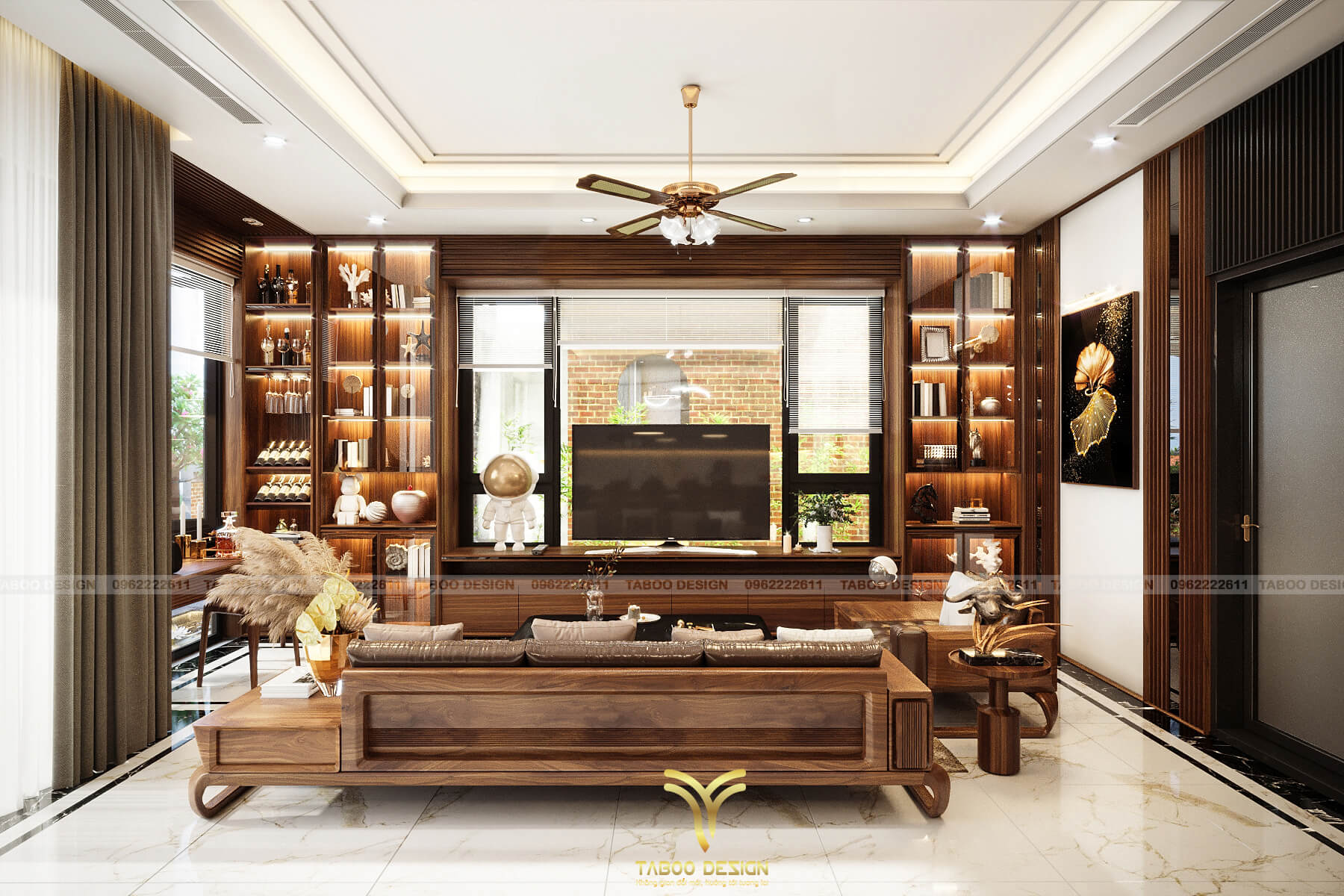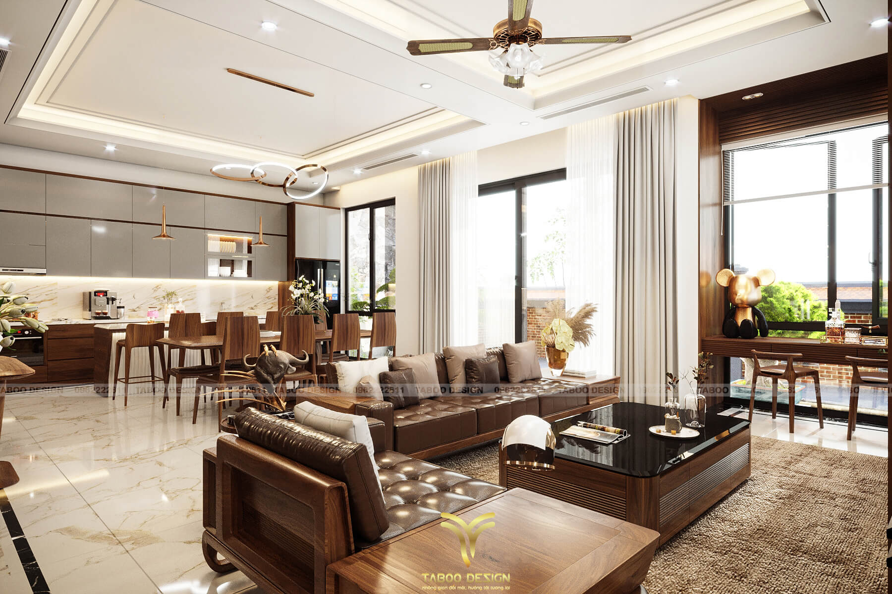 Phòng khách là trung tâm của ngôi nhà, là không gian sinh hoạt, tiếp khách và cũng thể hiện sở thích, sựi bề thế của gia chủ. Vì thế, các kiến trúc sư Taboo Design đặc biệt chú trọng về mặt thẩm mỹ khi thiết kế nội thất phòng khách. Với không gian này, các kiến trúc sư đặc biệt quan tâm đến nguồn ánh sáng, vừa phong thủy, vừa giúp "ăn gian" diện tích tạo sự sang trọng hơn. Nổi bật chính là hệ thống các cửa chính, cửa sổ đa dạng, có sử dụng rèm che. Đèn sử dụng đèn chùm hiện đại, tinh tế. Bên cạnh đó là nội thất tận dụng chất liệu gỗ gõ đỏ đặc trưng của thiết kế hiện đại. Tạo nên không gian phòng khách bề thế, sang trọng và nổi trội.